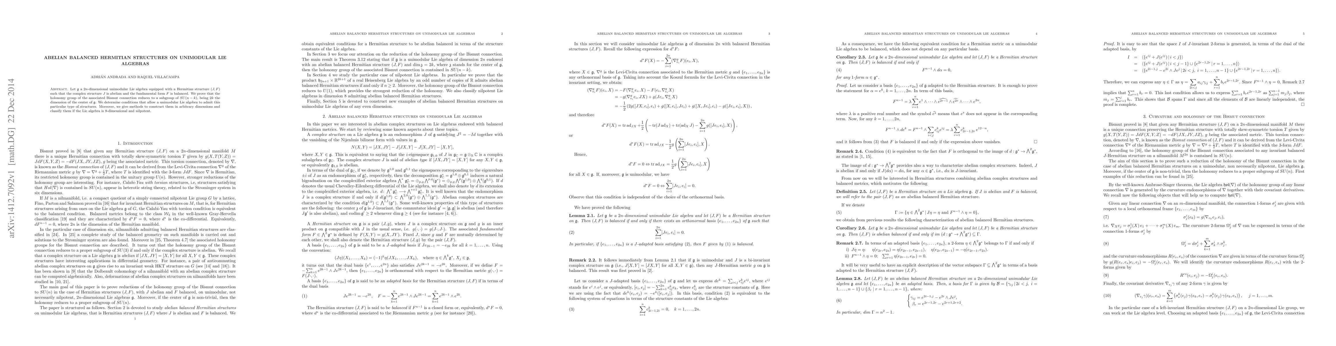 The paper explores abelian balanced Hermitian structures on $2n$-dimensional unimodular Lie algebras, proving that their holonomy groups are subgroups of $SU(n-k)$, where $2k$ is the center's dimension. It also provides methods to construct and classify such structures, especially for 8-dimensional nilpotent cases.