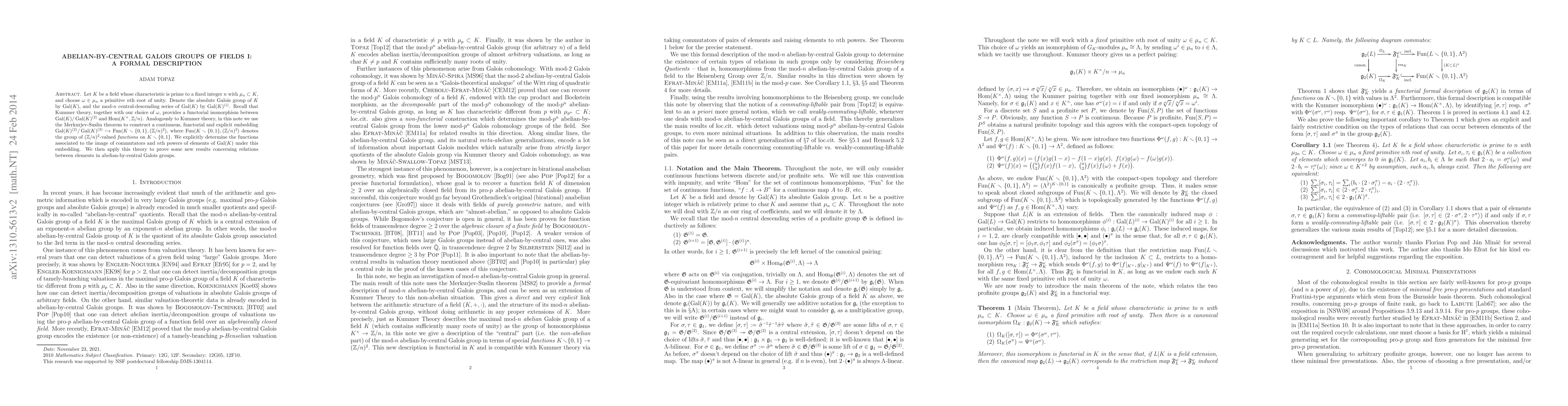Let $K$ be a field whose characteristic is prime to a fixed integer $n$ with $\mu_n \subset K$, and choose $\omega \in \mu_n$ a primitive $n$th root of unity. Denote the absolute Galois group of $K$ by $\operatorname{Gal}(K)$, and the mod-$n$ central-descending series of $\operatorname{Gal}(K)$ by $\operatorname{Gal}(K)^{(i)}$. Recall that Kummer theory, together with our choice of $\omega$, provides a functorial isomorphism between $\operatorname{Gal}(K)/\operatorname{Gal}(K)^{(2)}$ and $\operatorname{Hom}(K^\times,\mathbb{Z}/n)$. Analogously to Kummer theory, in this note we use the Merkurjev-Suslin theorem to construct a continuous, functorial and explicit embedding $\operatorname{Gal}(K)^{(2)}/\operatorname{Gal}(K)^{(3)} \hookrightarrow \operatorname{Fun}(K\smallsetminus\{0,1\},(\mathbb Z/n)^2)$, where $\operatorname{Fun}(K\smallsetminus\{0,1\},(\mathbb Z/n)^2)$ denotes the group of $(\mathbb Z/n)^2$-valued functions on $K\smallsetminus\{0,1\}$. We explicitly determine the functions associated to the image of commutators and $n$th powers of elements of $\operatorname{Gal}(K)$ under this embedding. We then apply this theory to prove some new results concerning relations between elements in abelian-by-central Galois groups.