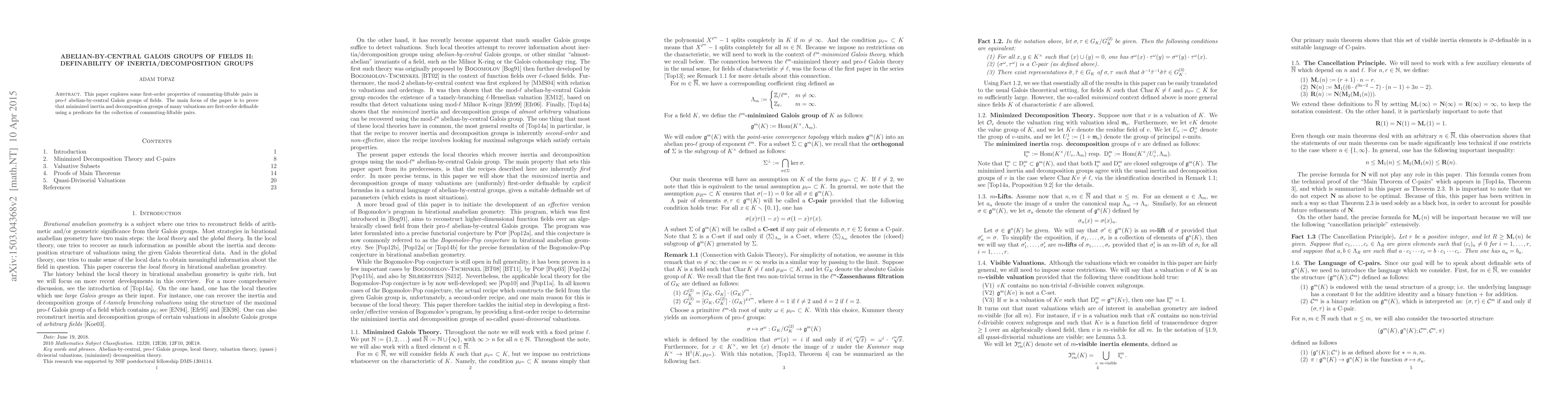 This paper explores some first-order properties of commuting-liftable pairs in pro-$\ell$ abelian-by-central Galois groups of fields. The main focus of the paper is to prove that minimized inertia and decomposition groups of many valuations are first-order definable using a predicate for the collection of commuting-liftable pairs.