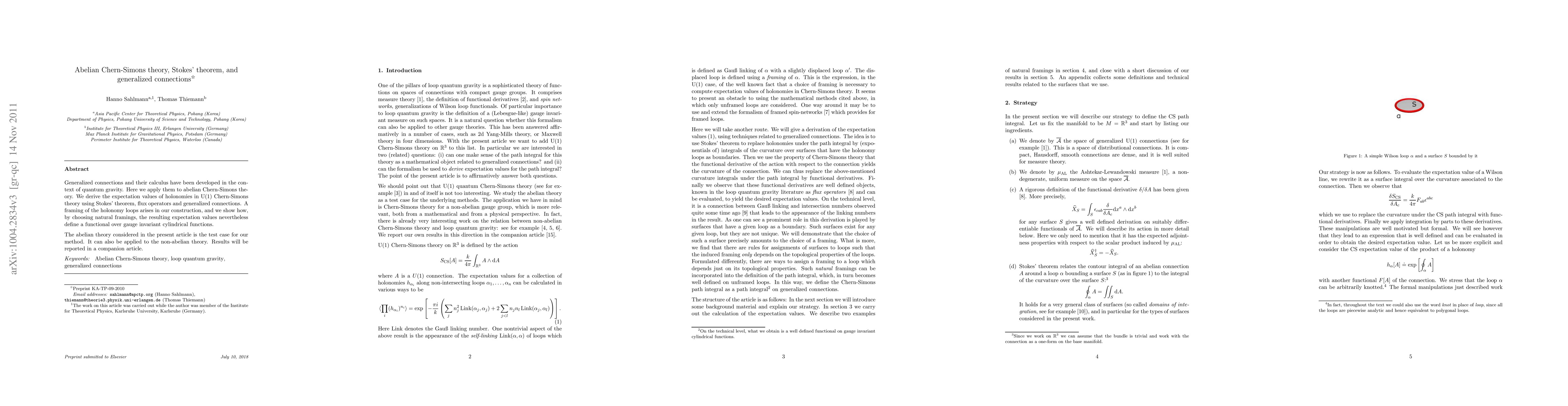 Generalized connections and their calculus have been developed in the context of quantum gravity. Here we apply them to abelian Chern-Simons theory. We derive the expectation values of holonomies in U(1) Chern-Simons theory using Stokes' theorem, flux operators and generalized connections. A framing of the holonomy loops arises in our construction, and we show how, by choosing natural framings, the resulting expectation values nevertheless define a functional over gauge invariant cylindrical functions. The abelian theory considered in the present article is test case for our method. It can also be applied to the non-abelian theory. Results for that case will be reported elsewhere.