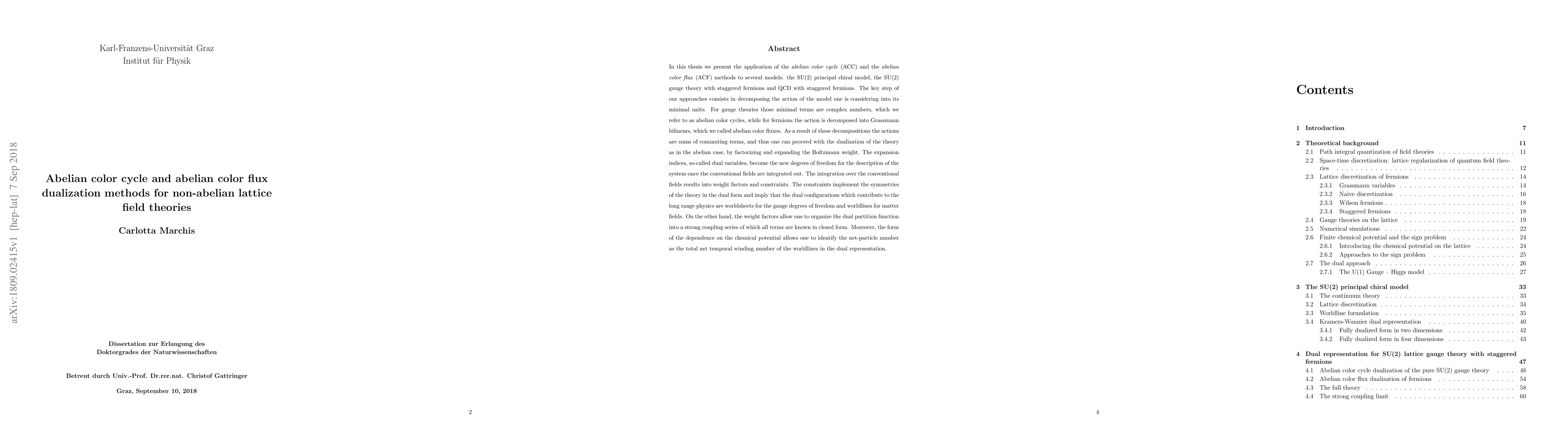 In this thesis we present the application of the \textit{abelian color cycle} (ACC) and the \textit{abelian color flux} (ACF) methods to several models: the SU(2) principal chiral model, the SU(2) gauge theory with staggered fermions and QCD with staggered fermions. The key step of our approaches consists in decomposing the action of the model one is considering into its minimal units. For gauge theories those minimal terms are complex numbers, which we refer to as abelian color cycles, while for fermions the action is decomposed into Grassmann bilinears, which we called abelian color fluxes. As a result of these decompositions the actions are sums of commuting terms, and thus one can proceed with the dualization of the theory as in the abelian case, by factorizing and expanding the Boltzmann weight. The expansion indices, so-called dual variables, become the new degrees of freedom for the description of the system once the conventional fields are integrated out. The integration over the conventional fields results into weight factors and constraints. The constraints implement the symmetries of the theory in the dual form and imply that the dual configurations which contribute to the long range physics are worldsheets for the gauge degrees of freedom and worldlines for matter fields. On the other hand, the weight factors allow one to organize the dual partition function into a strong coupling series of which all terms are known in closed form. Moreover, the form of the dependence on the chemical potential allows one to identify the net-particle number as the total net temporal winding number of the worldlines in the dual representation.