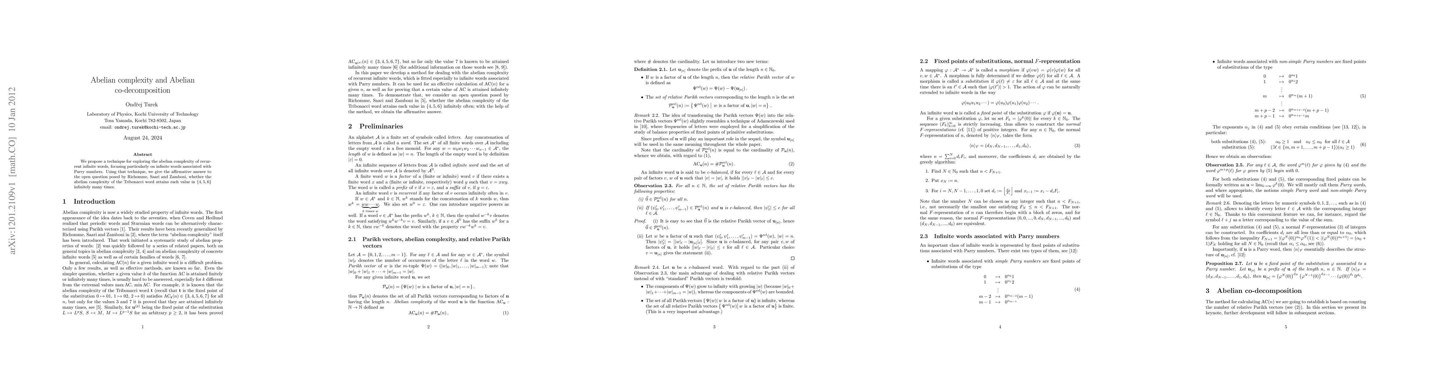 This paper introduces a new method to study the abelian complexity of recurrent infinite words, specifically those linked to Parry numbers. It confirms that the abelian complexity of the Tribonacci word reaches each value in the set {4, 5, 6} infinitely often, answering an open question posed by Richomme, Saari, and Zamboni.