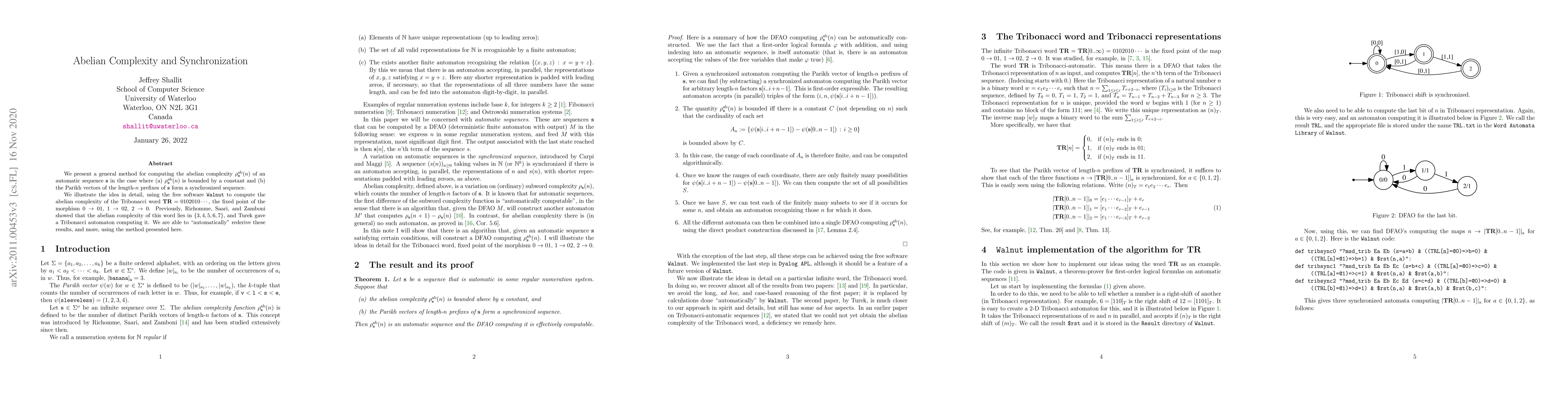 The paper presents a method for computing the abelian complexity of automatic sequences using synchronized sequences and the free software Walnut, illustrated with the Tribonacci word.
