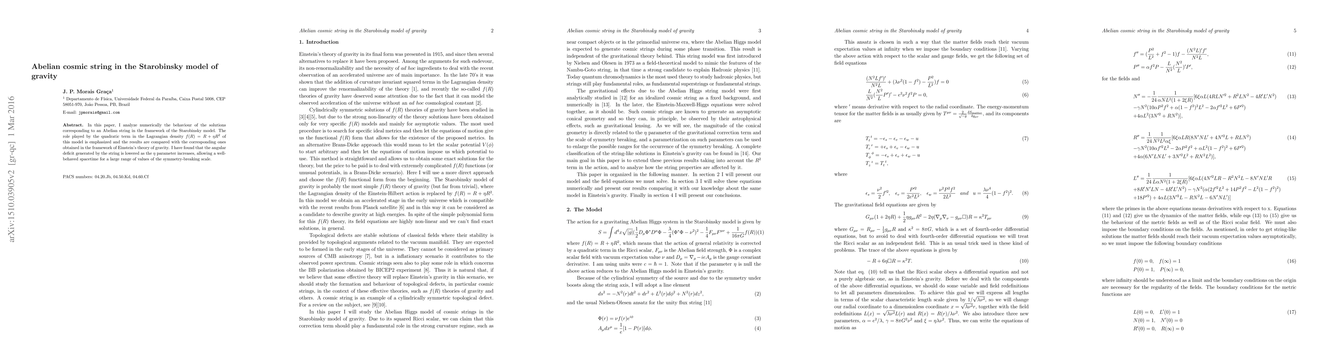 In this paper, I analyze numerically the behaviour of the solutions corresponding to an Abelian string in the framework of the Starobinsky model. The role played by the quadratic term in the Lagrangian density $f(R) = R + \eta R^2$ of this model is emphasized and the results are compared with the corresponding ones obtained in the framework of Einstein's theory of gravity. I have found that the angular deficit generated by the string is lowered as the $\eta$ parameter increases, allowing a well-behaved spacetime for a large range of values of the symmetry-breaking scale.