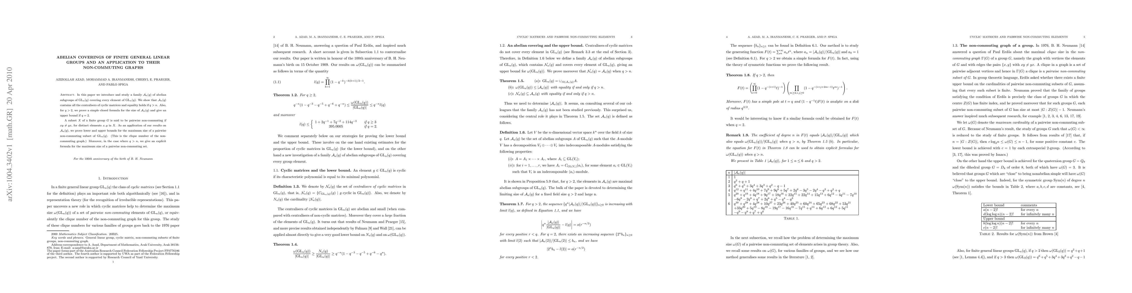In this paper we introduce and study a family $\mathcal{A}_n(q)$ of abelian subgroups of $\GL_n(q)$ covering every element of $\GL_n(q)$. We show that $\mathcal{A}_n(q)$ contains all the centralisers of cyclic matrices and equality holds if $q>n$. Also, for $q>2$, we prove a simple closed formula for the size of $\mathcal{A}_n(q)$ and give an upper bound if $q=2$. A subset $X$ of a finite group $G$ is said to be pairwise non-commuting if $xy\not=yx$, for distinct elements $x, y$ in $X$. As an application of our results on $\mathcal{A}_n(q)$, we prove lower and upper bounds for the maximum size of a pairwise non-commuting subset of $\GL_n(q)$. (This is the clique number of the non-commuting graph.) Moreover, in the case where $q>n$, we give an explicit formula for the maximum size of a pairwise non-commuting set.