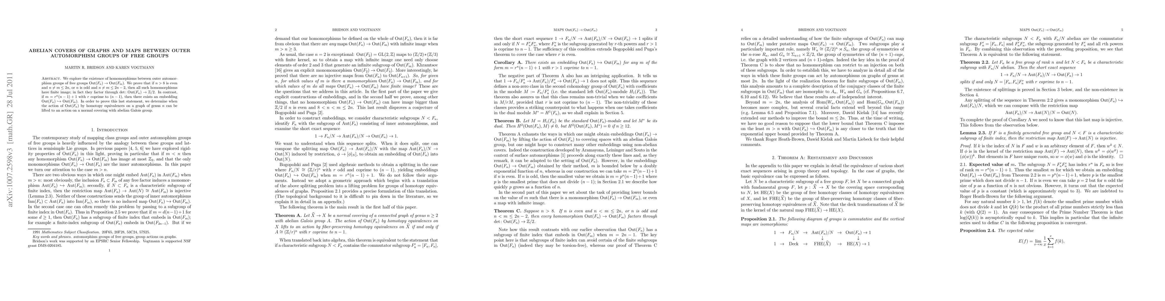 We explore the existence of homomorphisms between outer automorphism groups of free groups Out(F_n) \to Out(F_m). We prove that if n > 8 is even and n \neq m \leq 2n, or n is odd and n \neq m \leq 2n - 2, then all such homomorphisms have finite image; in fact they factor through det: Out(F_n) \to Z/2. In contrast, if m = r^n(n - 1) + 1 with r coprime to (n - 1), then there exists an embedding Out(F_n) \to Out(F_m). In order to prove this last statement, we determine when the action of Out(F_n) by homotopy equivalences on a graph of genus n can be lifted to an action on a normal covering with abelian Galois group.