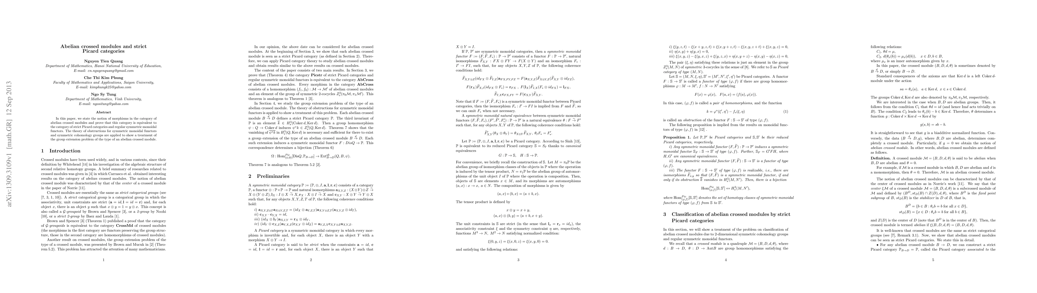 This paper introduces morphisms in the category of abelian crossed modules and establishes its equivalence to the category of strict Picard categories with regular symmetric monoidal functors. It utilizes the theory of obstructions and symmetric cohomology to address group extension problems akin to those in abelian crossed modules.