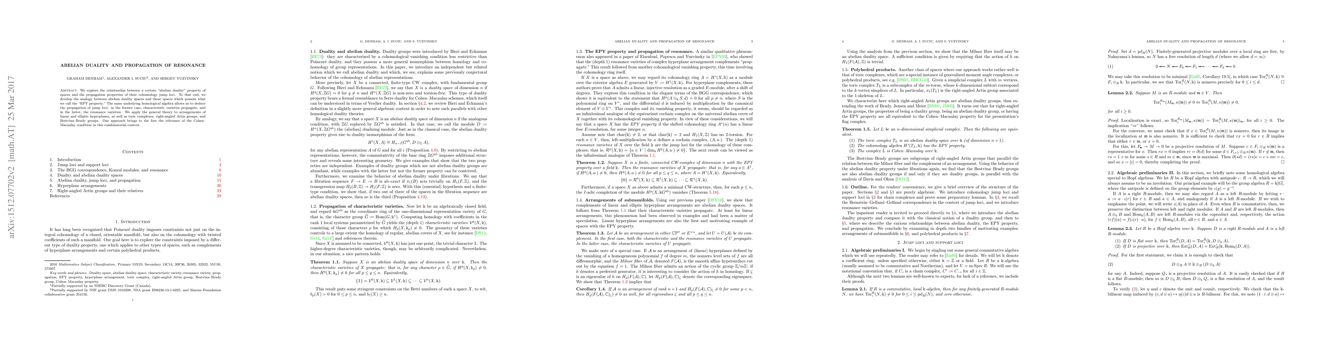 We explore the relationship between a certain "abelian duality" property of spaces and the propagation properties of their cohomology jump loci. To that end, we develop the analogy between abelian duality spaces and those spaces which possess what we call the "EPY property." The same underlying homological algebra allows us to deduce the propagation of jump loci: in the former case, characteristic varieties propagate, and in the latter, the resonance varieties. We apply the general theory to arrangements of linear and elliptic hyperplanes, as well as toric complexes, right-angled Artin groups, and Bestvina-Brady groups. Our approach brings to the fore the relevance of the Cohen-Macaulay condition in this combinatorial context.