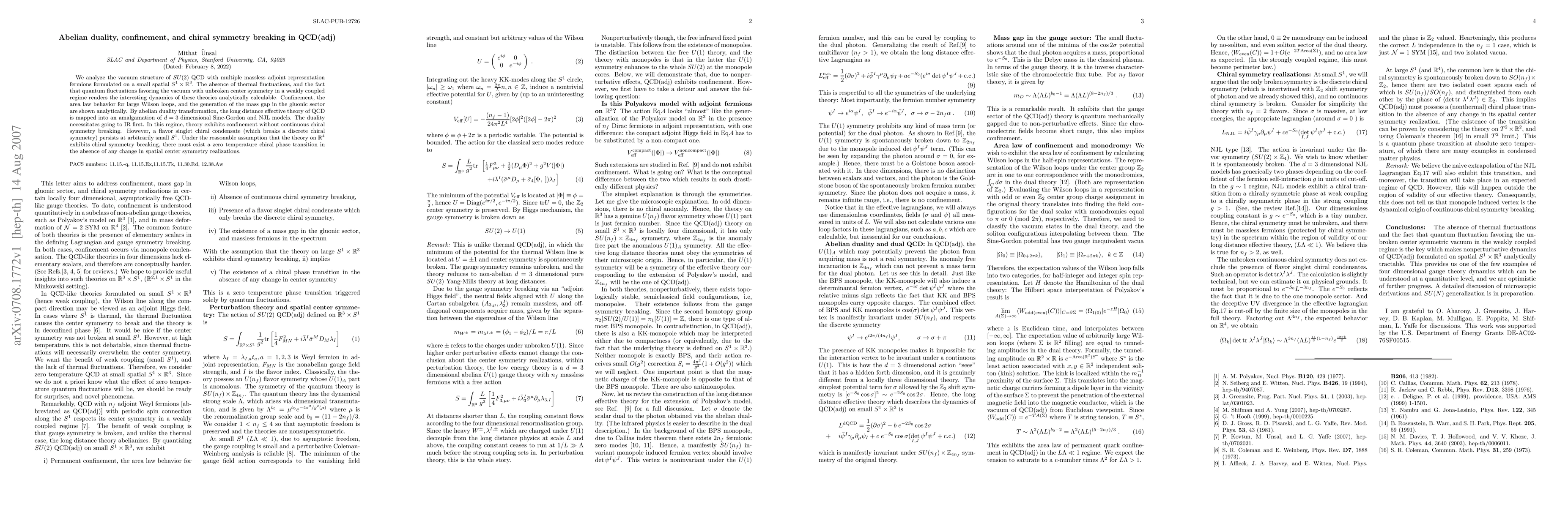 We analyze the vacuum structure of SU(2) QCD with multiple massless adjoint representation fermions formulated on a small spatial $S^1 \times \R^3$. The absence of thermal fluctuations, and the fact that quantum fluctuations favoring the vacuum with unbroken center symmetry in a weakly coupled regime renders the interesting dynamics of these theories analytically calculable. Confinement, the area law behavior for large Wilson loops, and the generation of the mass gap in the gluonic sector are shown analytically. By abelian duality transformation, the long distance effective theory of QCD is mapped into an amalgamation of $d=3$ dimensional Sine-Gordon and NJL models. The duality necessitates going to IR first. In this regime, theory exhibits confinement without continuous chiral symmetry breaking. However, a flavor singlet chiral condensate (which breaks a discrete chiral symmetry) persists at arbitrarily small $S^1$. Under the reasonable assumption that the theory on $\R^4$ exhibits chiral symmetry breaking, there must exist a zero temperature chiral phase transition in the absence of any change in spatial center symmetry realizations.