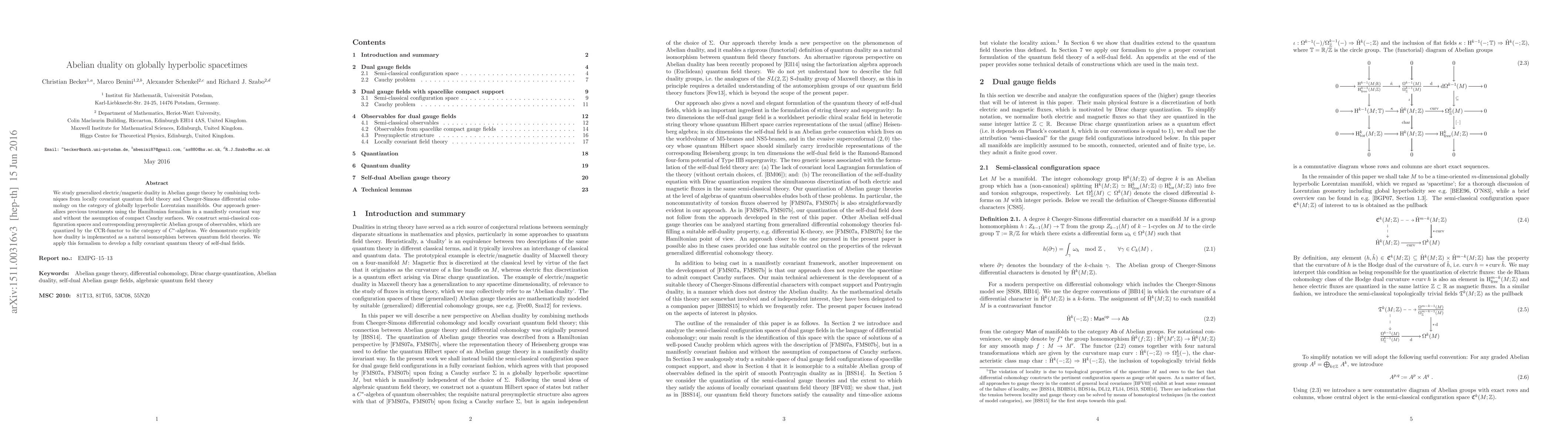 We study generalized electric/magnetic duality in Abelian gauge theory by combining techniques from locally covariant quantum field theory and Cheeger-Simons differential cohomology on the category of globally hyperbolic Lorentzian manifolds. Our approach generalizes previous treatments using the Hamiltonian formalism in a manifestly covariant way and without the assumption of compact Cauchy surfaces. We construct semi-classical configuration spaces and corresponding presymplectic Abelian groups of observables, which are quantized by the CCR-functor to the category of $C^*$-algebras. We demonstrate explicitly how duality is implemented as a natural isomorphism between quantum field theories. We apply this formalism to develop a fully covariant quantum theory of self-dual fields.