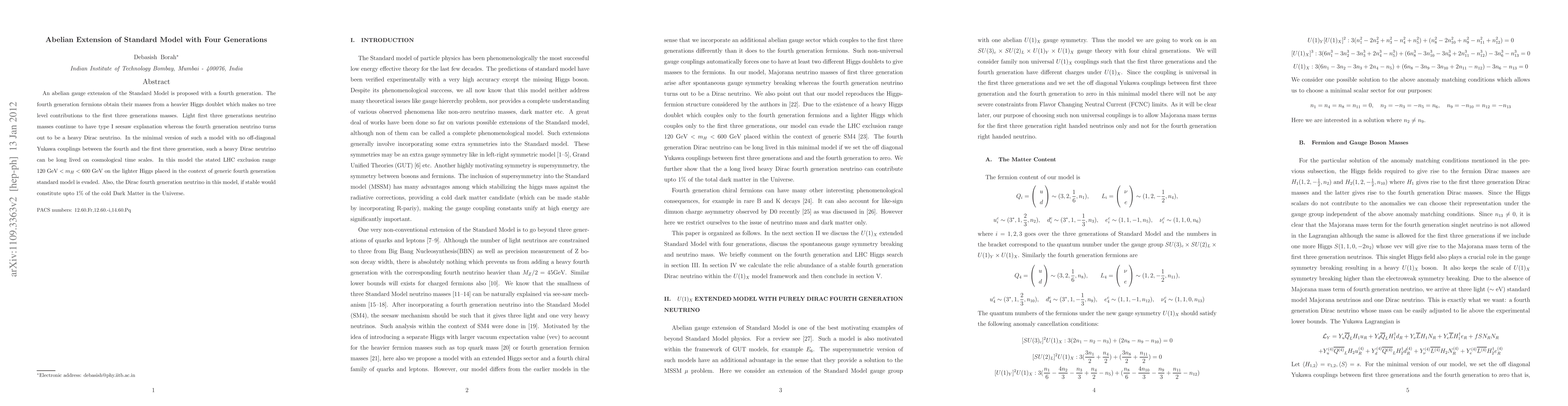 An abelian gauge extension of the Standard Model is proposed with a fourth generation. The fourth generation fermions obtain their masses from a heavier Higgs doublet which makes no tree level contributions to the first three generations masses. Light first three generations neutrino masses continue to have type I seesaw explanation whereas the fourth generation neutrino turns out to be a heavy Dirac neutrino. In the minimal version of such a model with no off-diagonal Yukawa couplings between the fourth and the first three generation, such a heavy Dirac neutrino can be long lived on cosmological time scales. In this model the stated LHC exclusion range $120 \; \text{GeV} < m_H < 600 \; \text{GeV}$ on the lighter Higgs placed in the context of generic fourth generation standard model is evaded. Also, the Dirac fourth generation neutrino in this model, if stable would constitute upto 1% of the cold Dark Matter in the Universe.