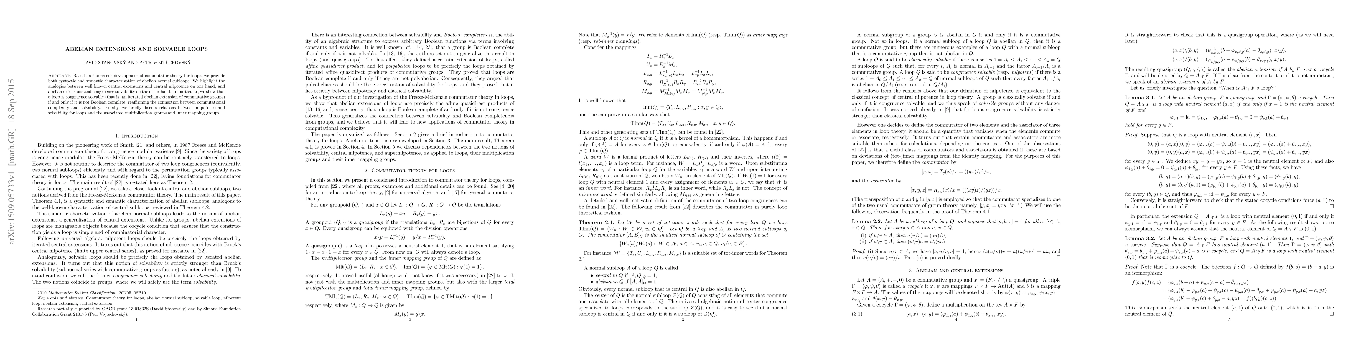 This paper characterizes abelian normal subloops in loops using recent commutator theory, drawing parallels between central extensions and abelian extensions. It concludes that a loop is congruence solvable if and only if it is not Boolean complete, linking computational complexity with solvability.