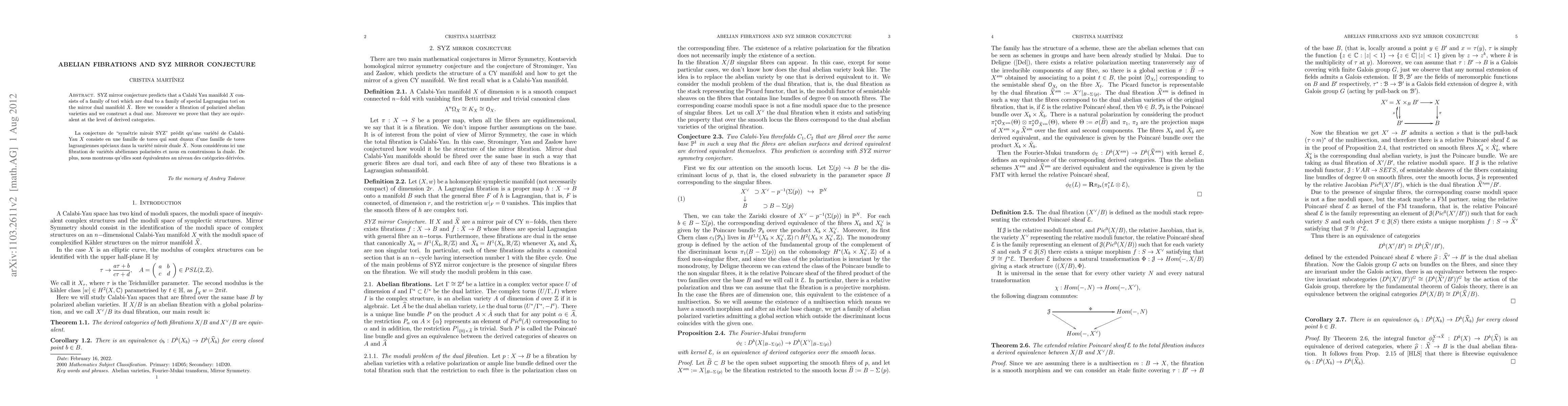 The SYZ mirror conjecture posits that a Calabi-Yau manifold $X$ has a dual relationship with its mirror $\hat{X}$ through special Lagrangian tori. This paper explores abelian fibrations and constructs a dual fibration, proving their equivalence at the level of derived categories.