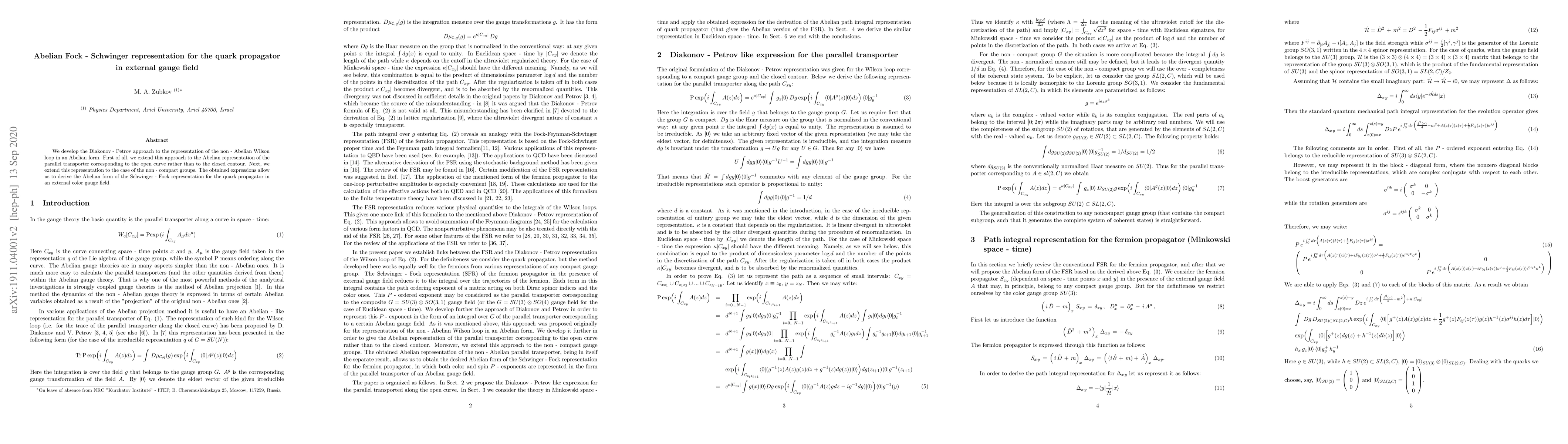 We develop the Diakonov-Petrov approach to the representation of the non-Abelian Wilson loop in an Abelian form. First of all, we extend this approach to the Abelian representation of the parallel transporter corresponding to the open curve rather than to the closed contour. Next, we extend this representation to the case of the non-compact groups. The obtained expressions allow to derive the Abelian form of the Schwinger-Fock representation for the quark propagator in an external color gauge field.