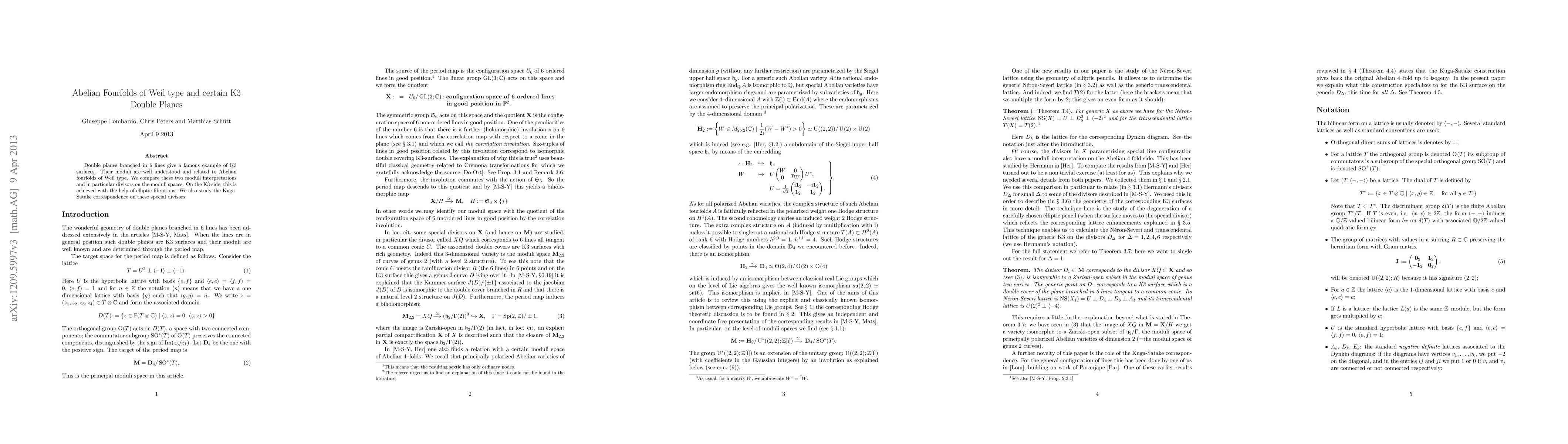 Double planes branched in 6 lines give a famous example of K3 surfaces. Their moduli are well understood and related to abelian fourfolds of Weil type. We compare these two moduli interpretations and in particular divisors on the moduli spaces. On the K3 side, this is achieved with the help of elliptic fibrations. We also study the Kuga-Satake correspondence on these special divisors.