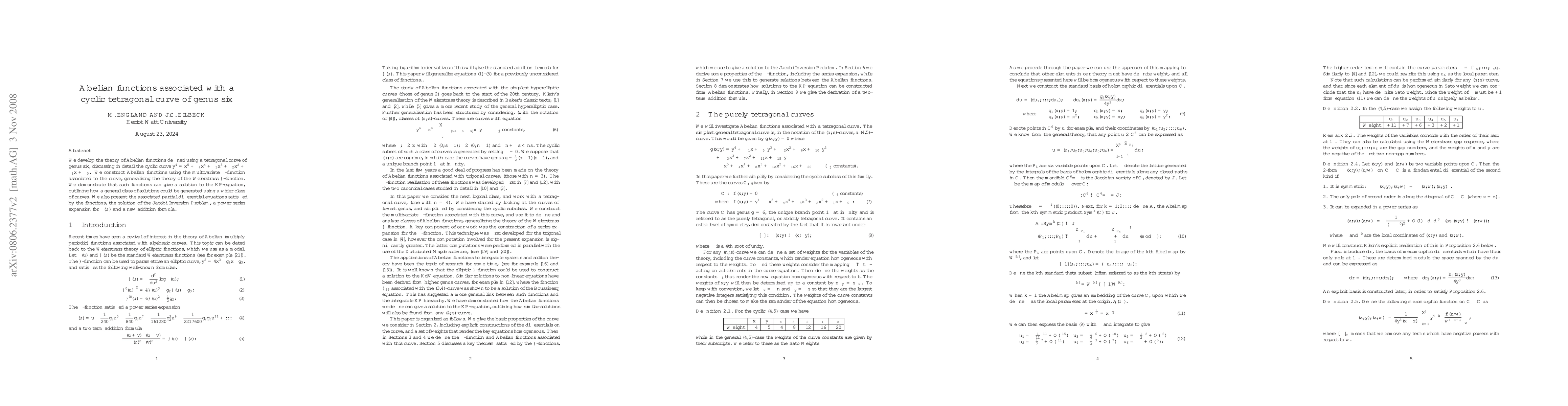This paper develops the theory of Abelian functions for a cyclic tetragonal curve of genus six, constructing these functions via a multivariate $\sigma$-function and demonstrating their utility in solving the KP-equation. It also presents associated partial differential equations, a solution to the Jacobi Inversion Problem, and a new addition formula.