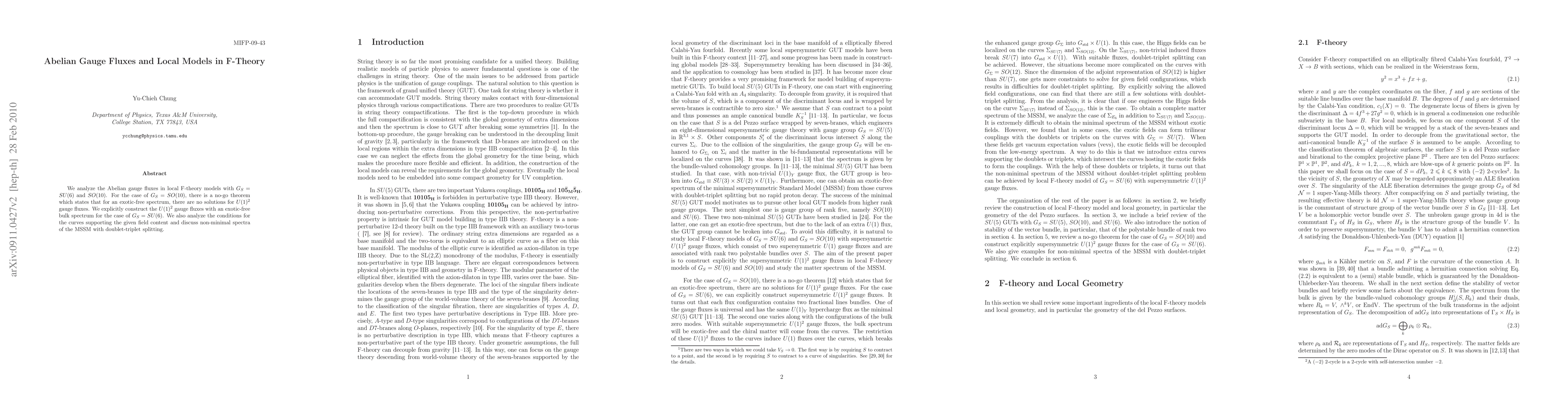 This paper constructs Abelian gauge fluxes in local F-theory models with G_S=SU(6), overcoming the no-go theorem for G_S=SO(10) that precludes U(1)^2 gauge fluxes for an exotic-free spectrum. It also explores the conditions for field content supporting curves and non-minimal spectra of the MSSM with doublet-triplet splitting.