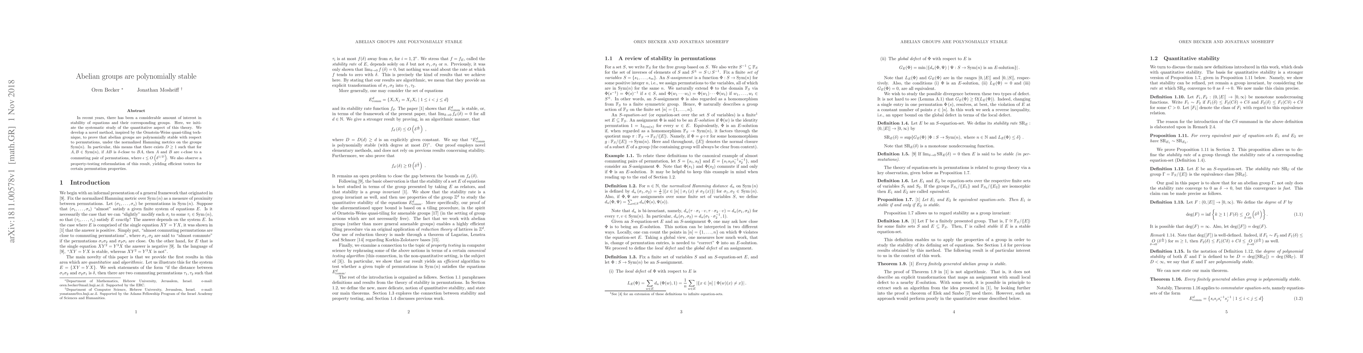 In recent years, there has been a considerable amount of interest in stability of equations and their corresponding groups. Here, we initiate the systematic study of the quantitative aspect of this theory. We develop a novel method, inspired by the Ornstein-Weiss quasi-tiling technique, to prove that abelian groups are polynomially stable with respect to permutations, under the normalized Hamming metrics on the groups $\operatorname{Sym}(n)$. In particular, this means that there exists $D\geq 1$ such that for $A,B\in \operatorname{Sym}(n)$, if $AB$ is $\delta$-close to $BA$, then $A$ and $B$ are $\epsilon$-close to a commuting pair of permutations, where $\epsilon\leq O(\delta^{1/D})$. We also observe a property-testing reformulation of this result, yielding efficient testers for certain permutation properties.