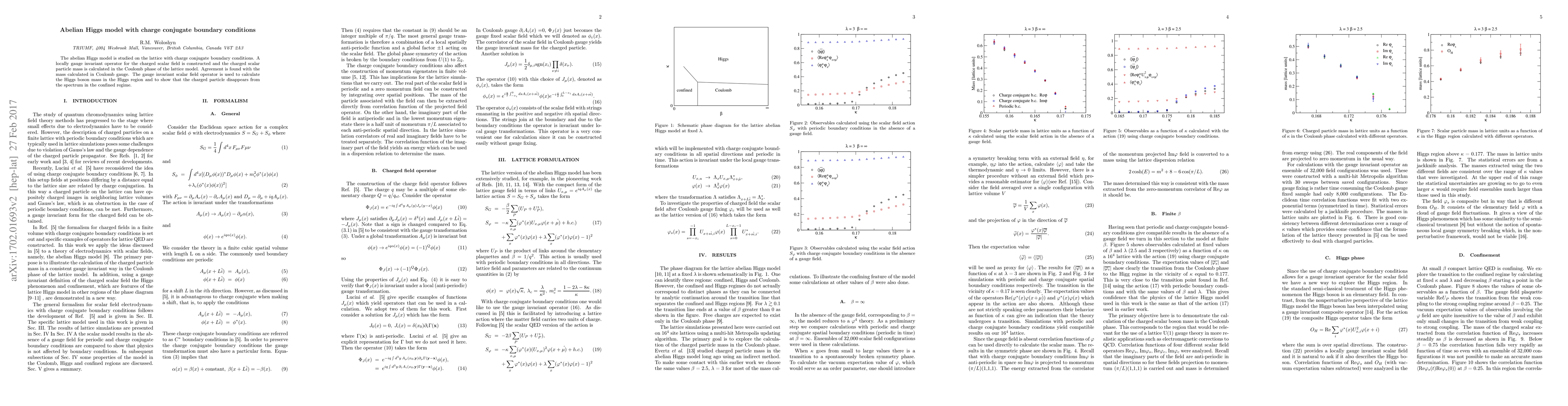 This paper investigates the abelian Higgs model on a lattice with charge conjugate boundary conditions, constructing a gauge invariant operator for the charged scalar field. It finds agreement between the calculated charged scalar particle mass in the Coulomb phase and the mass in Coulomb gauge, and demonstrates the disappearance of charged particles in the confined regime.