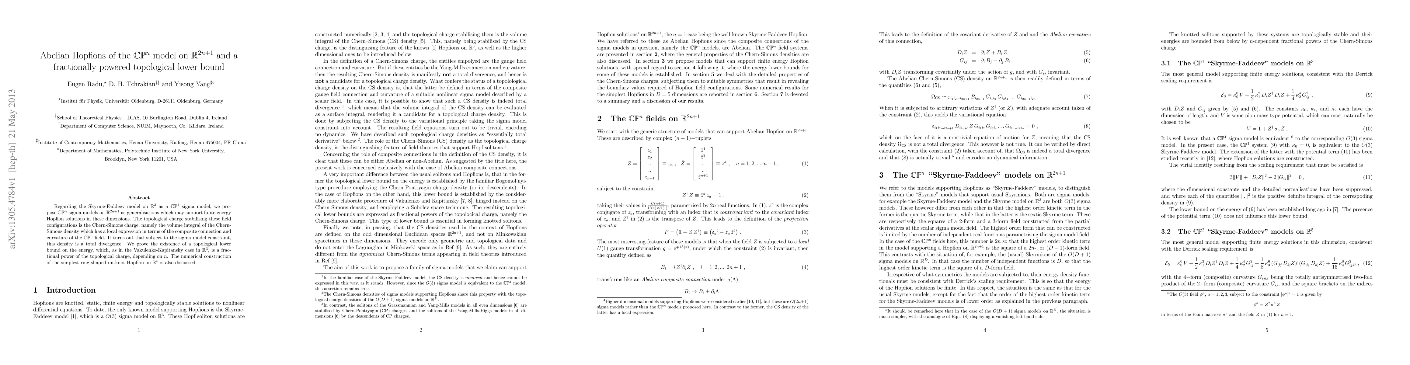 Regarding the Skyrme-Faddeev model on $\mathbb R^3$ as a $\mathbb C \mathbb P^1$ sigma model, we propose $\mathbb C \mathbb P^n$ sigma models on $\mathbb R^{2n+1}$ as generalisations which may support finite energy Hopfion solutions in these dimensions. The topological charge stabilising these field configurations is the Chern-Simons charge, namely the volume integral of the Chern-Simons density which has a local expression in terms of the composite connection and curvature of the CP^n field. It turns out that subject to the sigma model constraint, this density is a total divergence. We prove the existence of a topological lower bound on the energy, which, as in the Vakulenko-Kapitansky case in R^3, is a fractional power of the topological charge, depending on $n$. The numerical construction of the simplest ring shaped un-knot Hopfion on R^5 is also discussed.