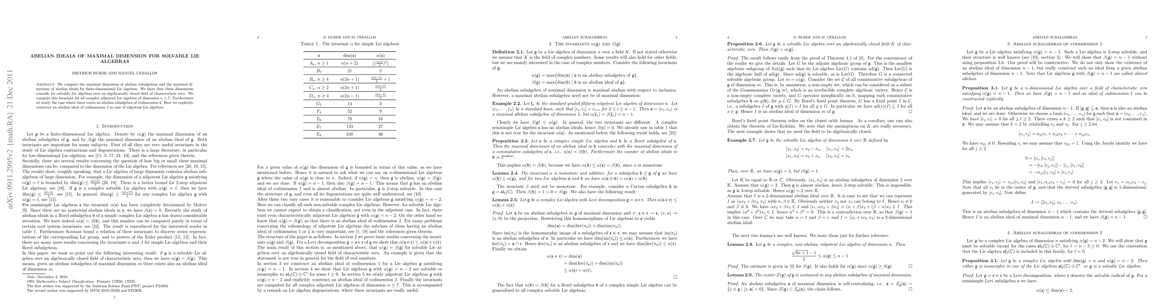 This paper investigates the dimensions of abelian subalgebras and abelian ideals in solvable Lie algebras, proving they are equal for such algebras over an algebraically closed field of characteristic zero. It also provides explicit constructions for abelian ideals of codimension 2 in complex nilpotent Lie algebras of small dimensions.