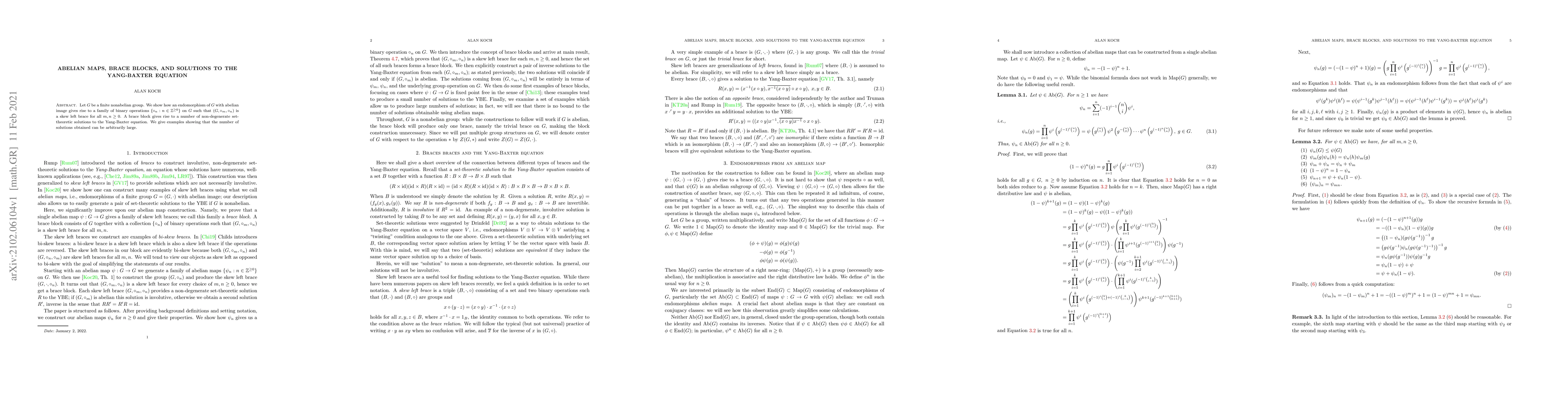Let $G$ be a finite nonabelian group. We show how an endomorphism of $G$ with abelian image gives rise to a family of binary operations $\{\circ_n: n\in \mathbb Z^{\ge 0}\}$ on $G$ such that $(G,\circ_m,\circ_n)$ is a skew left brace for all $m,n\ge 0$. A brace block gives rise to a number of non-degenerate set-theoretic solutions to the Yang-Baxter equation. We give examples showing that the number of solutions obtained can be arbitrarily large.