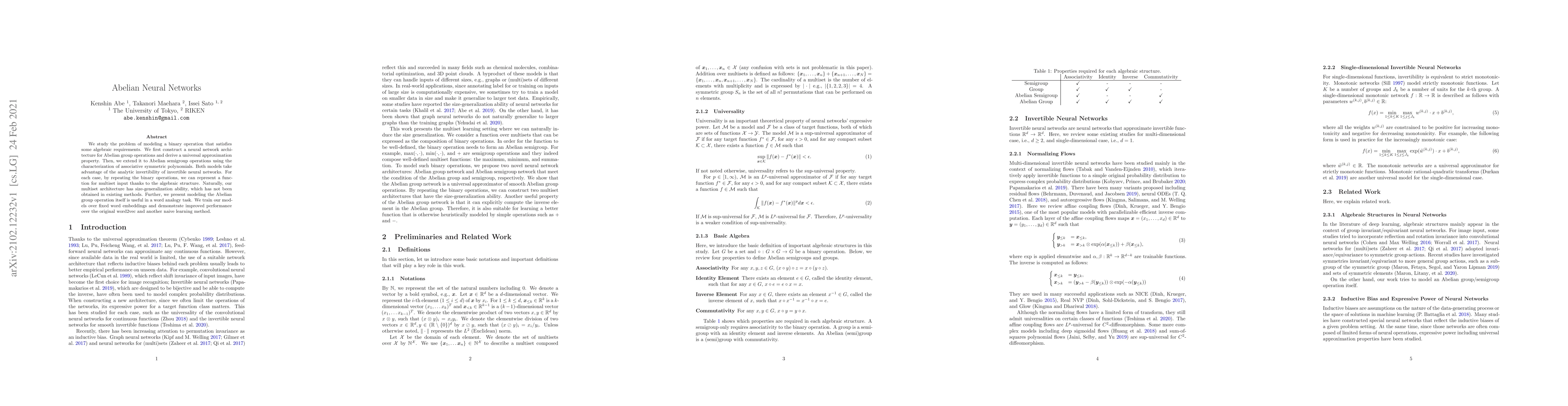 We study the problem of modeling a binary operation that satisfies some algebraic requirements. We first construct a neural network architecture for Abelian group operations and derive a universal approximation property. Then, we extend it to Abelian semigroup operations using the characterization of associative symmetric polynomials. Both models take advantage of the analytic invertibility of invertible neural networks. For each case, by repeating the binary operations, we can represent a function for multiset input thanks to the algebraic structure. Naturally, our multiset architecture has size-generalization ability, which has not been obtained in existing methods. Further, we present modeling the Abelian group operation itself is useful in a word analogy task. We train our models over fixed word embeddings and demonstrate improved performance over the original word2vec and another naive learning method.