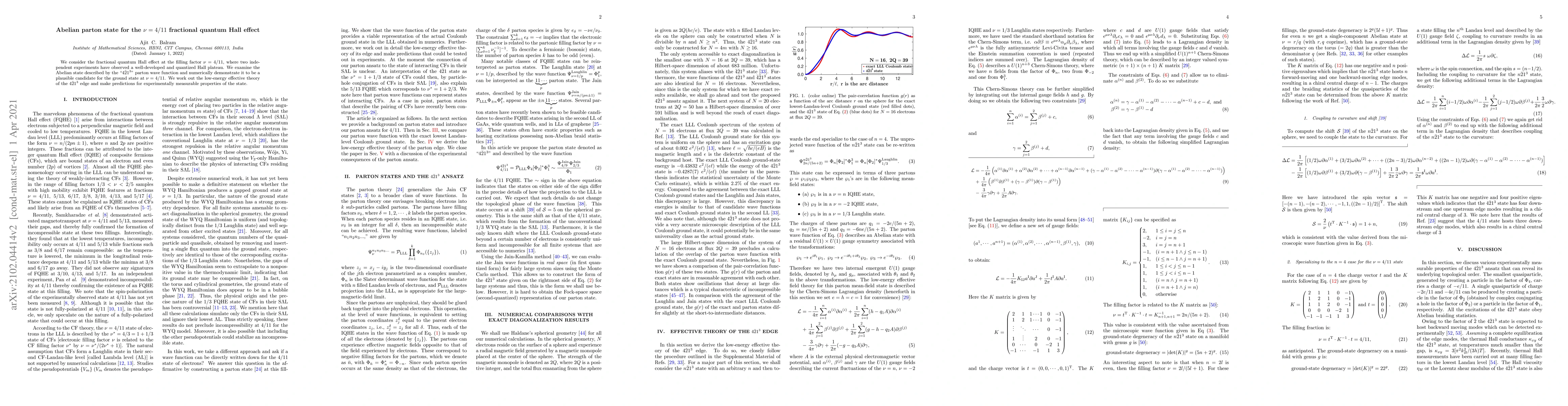 This research investigates the $\nu=4/11$ fractional quantum Hall effect, proposing the "4$\bar{2}1^{3}$" parton wave function as an Abelian state candidate. Numerical evidence supports its plausibility as the ground state, with detailed predictions for measurable properties.