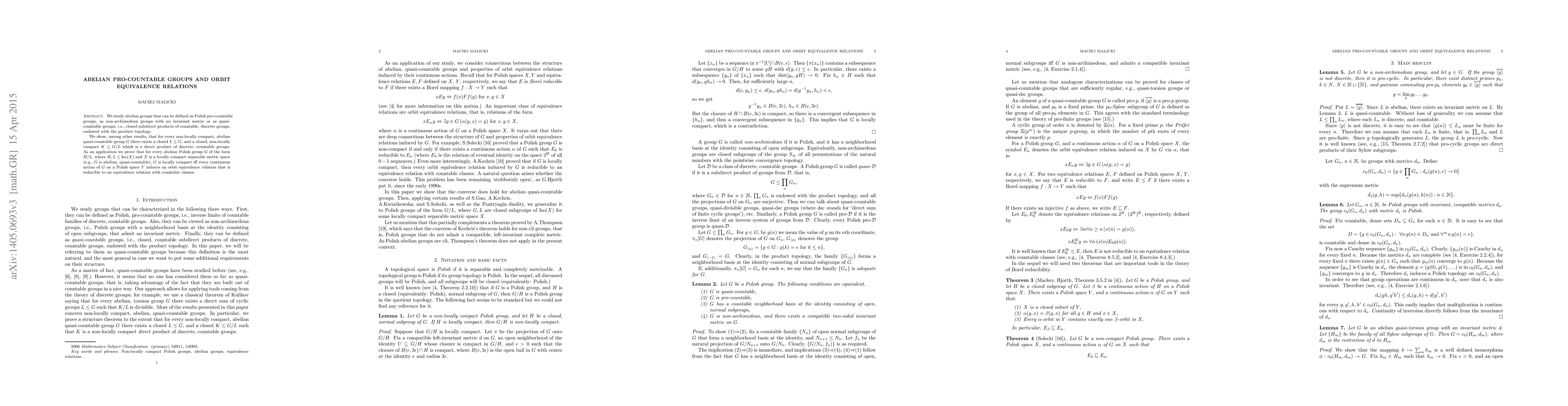 This paper explores abelian pro-countable groups, showing that for any non-locally compact, abelian quasi-countable group, there exists a specific closed subgroup structure. It concludes by proving that an abelian Polish group is locally compact if every continuous action of the group induces an orbit equivalence relation with countable classes.