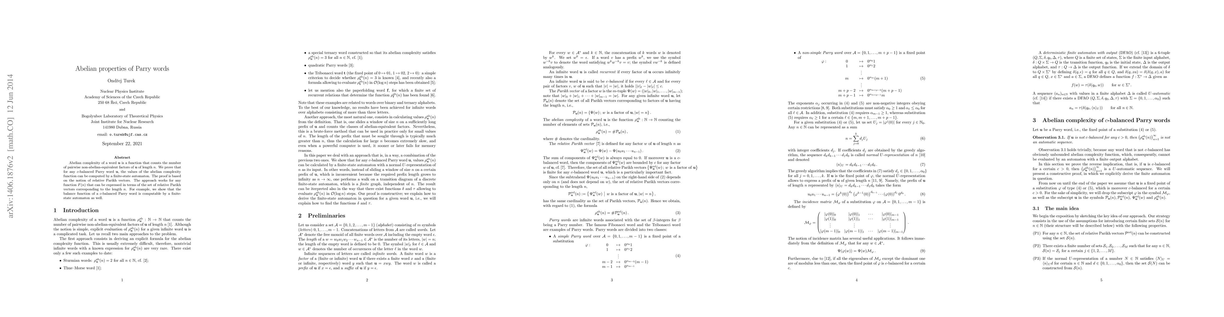 This research proves that abelian complexity of any c-balanced Parry word can be computed by a finite-state automaton, utilizing the concept of relative Parikh vectors. It also confirms that the balance function of a c-balanced Parry word is computable by a finite-state automaton.