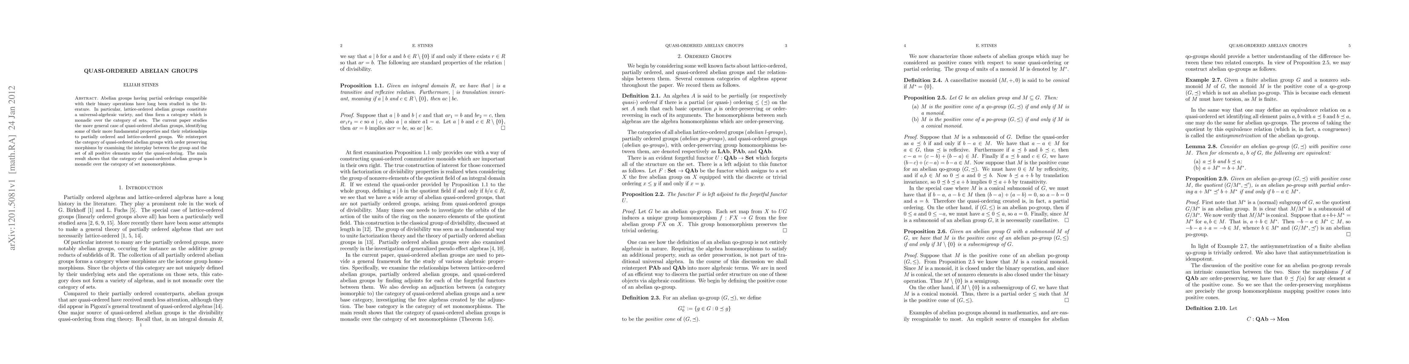 This paper investigates quasi-ordered abelian groups, focusing on their fundamental properties and their connections to partially and lattice-ordered groups. It demonstrates that the category of quasi-ordered abelian groups is monadic over the category of set monomorphisms, highlighting the interplay between group operations and the set of positive elements.