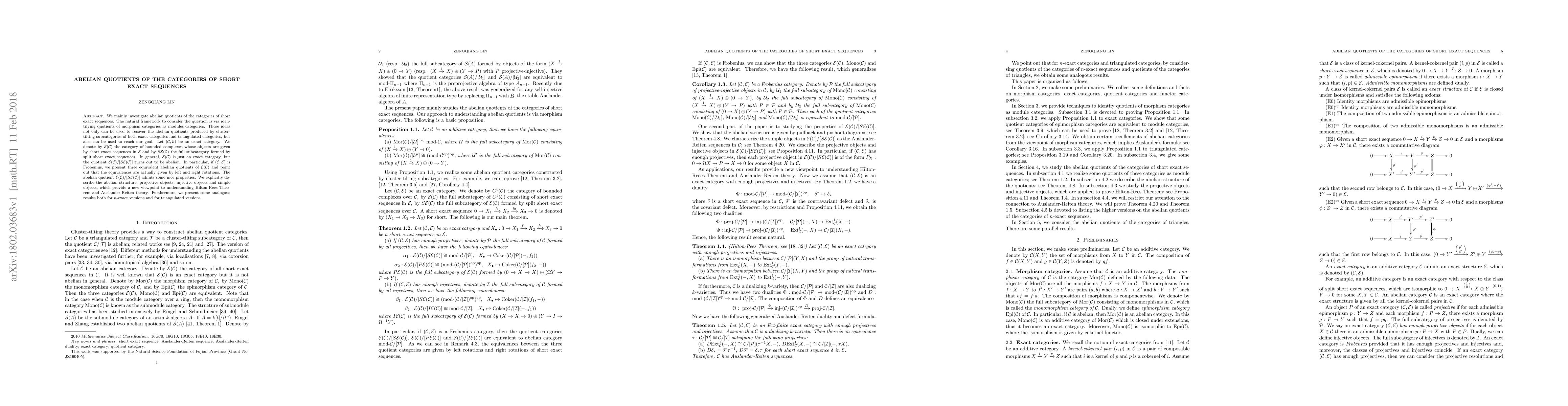 We mainly investigate abelian quotients of the categories of short exact sequences. The natural framework to consider the question is via identifying quotients of morphism categories as modules categories. These ideas not only can be used to recover the abelian quotients produced by cluster-tilting subcategories of both exact categories and triangulated categories, but also can be used to reach our goal. Let $(\mathcal{C},\mathcal{E})$ be an exact category. We denote by $\mathcal{E}(\mathcal{C})$ the category of bounded complexes whose objects are given by short exact sequences in $\mathcal{E}$ and by $S\mathcal{E}(\mathcal{C})$ the full subcategory formed by split short exact sequences. In general, $\mathcal{E}(\mathcal{C})$ is just an exact category, but the quotient $\mathcal{E}(\mathcal{C})/[S\mathcal{E}(\mathcal{C})]$ turns out to be abelian. In particular, if $(\mathcal{C},\mathcal{E})$ is Frobenius, we present three equivalent abelian quotients of $\mathcal{E}(\mathcal{C})$ and point out that the equivalences are actually given by left and right rotations. The abelian quotient $\mathcal{E}(\mathcal{C})/[S\mathcal{E}(\mathcal{C})]$ admits some nice properties. We explicitly describe the abelian structure, projective objects, injective objects and simple objects, which provide a new viewpoint to understanding Hilton-Rees Theorem and Auslander-Reiten theory. Furthermore, we present some analogous results both for $n$-exact versions and for triangulated versions.