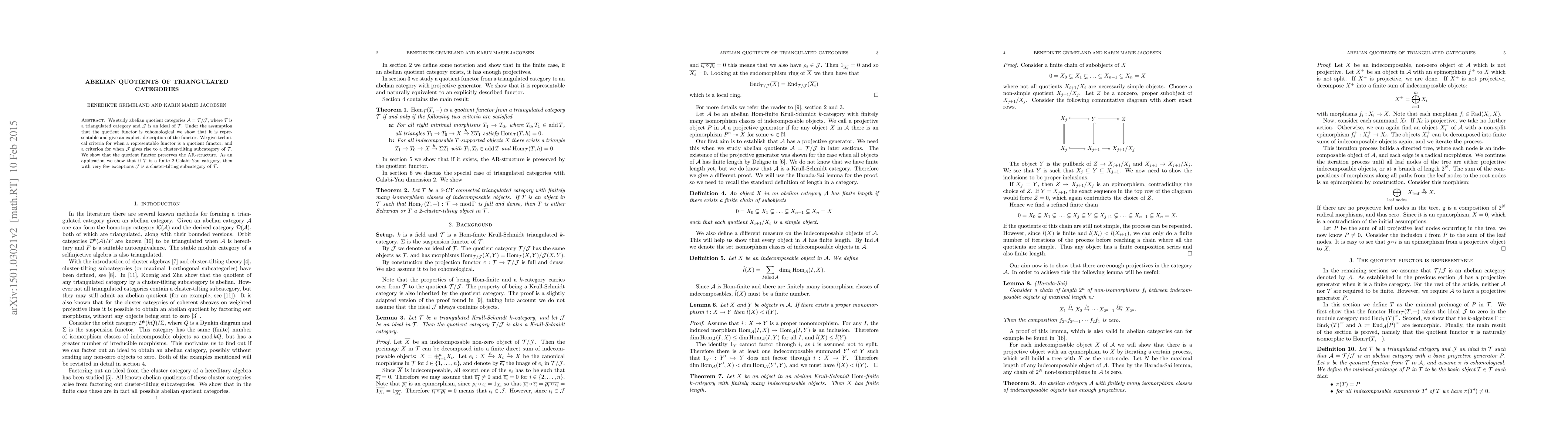 We study abelian quotient categories A=T/J, where T is a triangulated category and J is an ideal of T. Under the assumption that the quotient functor is cohomological we show that it is representable and give an explicit description of the functor. We give technical criteria for when a representable functor is a quotient functor, and a criterion for when J gives rise to a cluster-tilting subcategory of T. We show that the quotient functor preserves the AR-structure. As an application we show that if T is a finite 2-Calabi-Yau category, then with very few exceptions J is a cluster-tilting subcategory of T.
