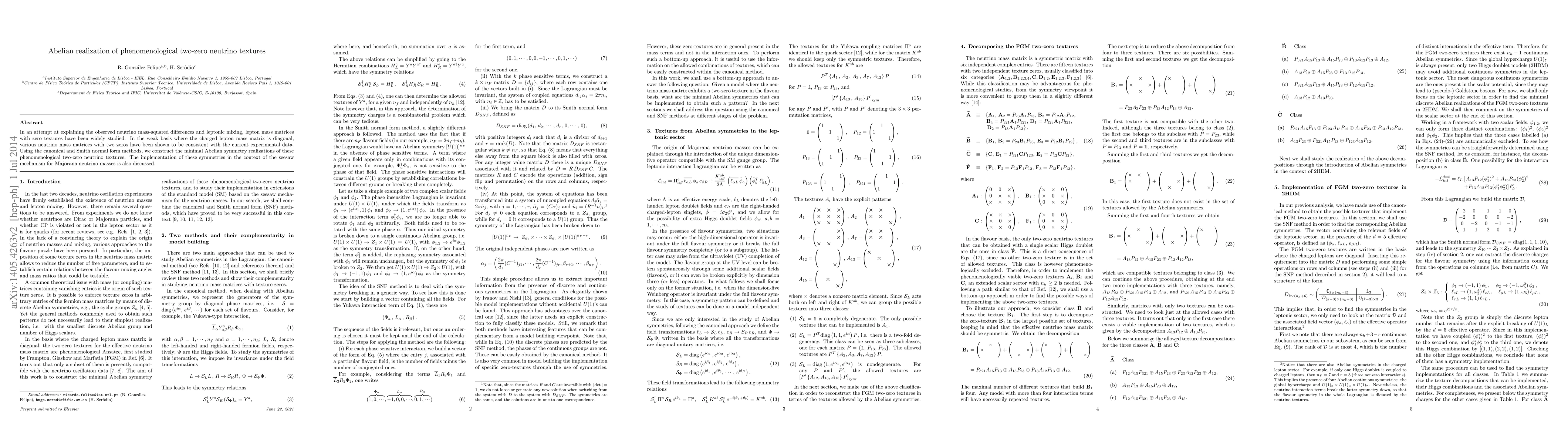 This paper constructs minimal Abelian symmetry realizations for phenomenological two-zero neutrino textures that align with observed neutrino mass-squared differences and leptonic mixing, and discusses their implementation in the seesaw mechanism for Majorana neutrino masses.