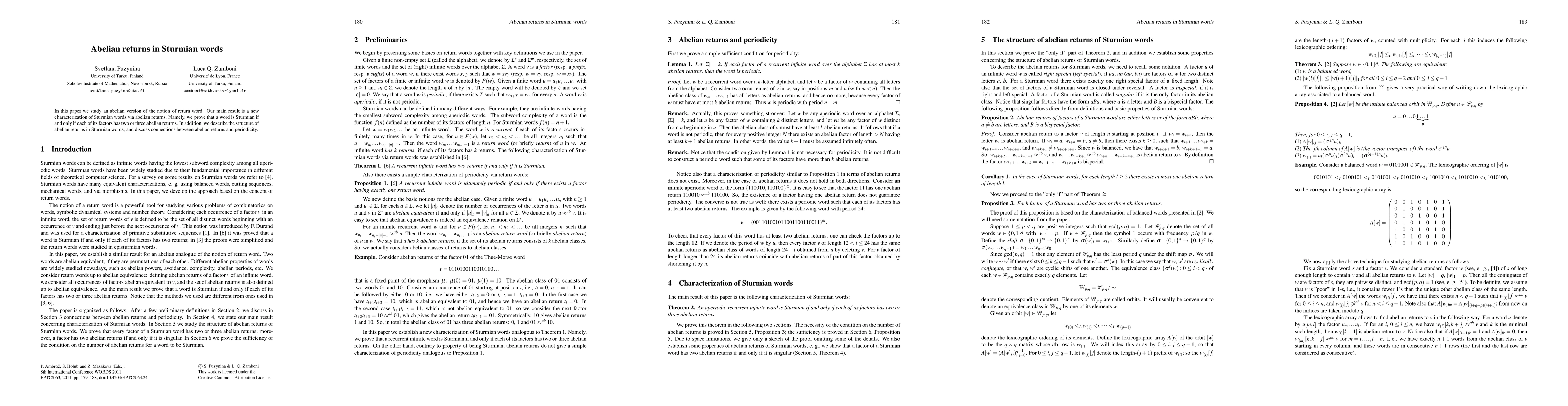 This paper characterizes Sturmian words by their abelian returns, proving that a word is Sturmian if and only if each of its factors has two or three abelian returns. It also explores the structure of these returns and their relation to periodicity.