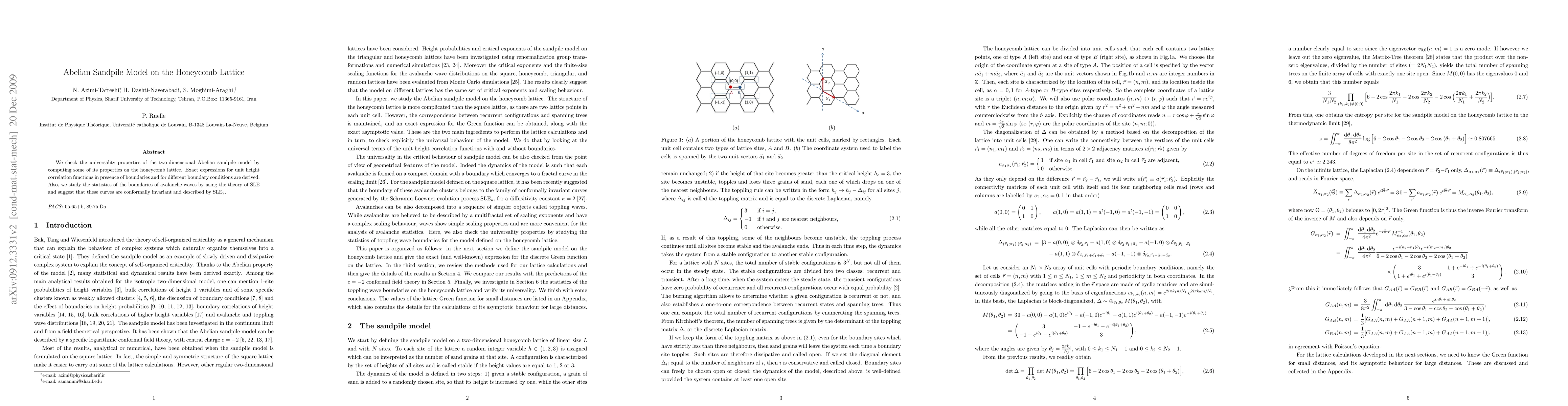 We check the universality properties of the two-dimensional Abelian sandpile model by computing some of its properties on the honeycomb lattice. Exact expressions for unit height correlation functions in presence of boundaries and for different boundary conditions are derived. Also, we study the statistics of the boundaries of avalanche waves by using the theory of SLE and suggest that these curves are conformally invariant and described by SLE2.