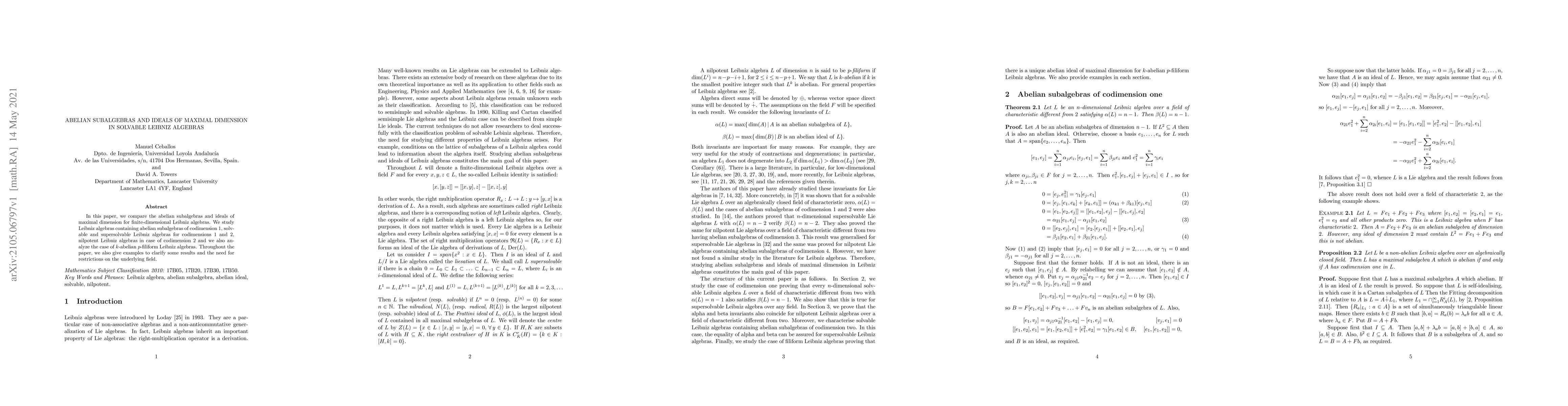 This paper investigates the abelian subalgebras and ideals of maximal dimension in finite-dimensional Leibniz algebras, focusing on various types including solvable, supersolvable, nilpotent, and k-abelian p-filiform algebras, while providing examples to illustrate key findings and the importance of field restrictions.