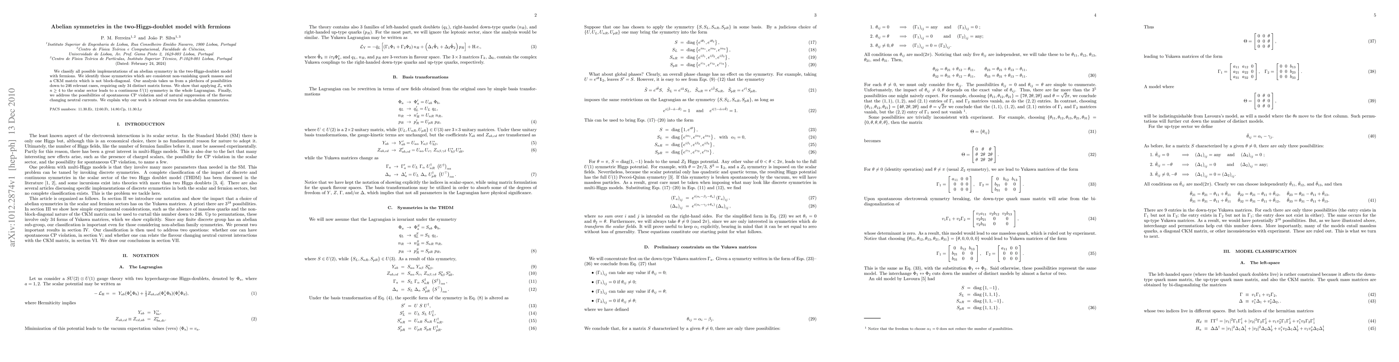 This paper classifies abelian symmetries in the two-Higgs-doublet model with fermions, identifying 246 relevant cases that allow for non-vanishing quark masses and a non-block-diagonal CKM matrix, while also exploring the implications for spontaneous CP violation and FCNC suppression.