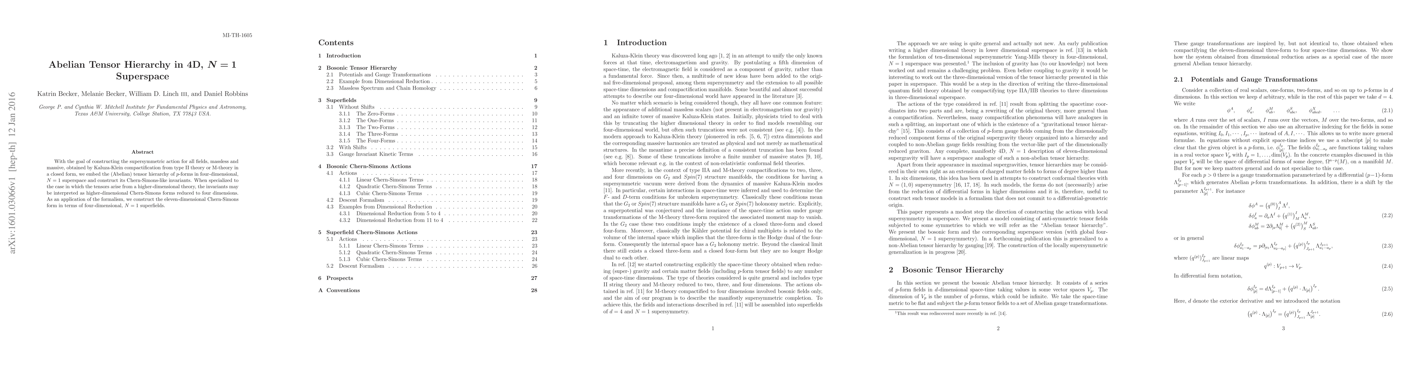 This paper constructs a supersymmetric action for fields from Kaluza-Klein compactification using Abelian tensor hierarchies in 4D N=1 superspace. It develops Chern-Simons-like invariants for these hierarchies, applicable to higher-dimensional theories, and specifically constructs the eleven-dimensional Chern-Simons form in four-dimensional superspace.