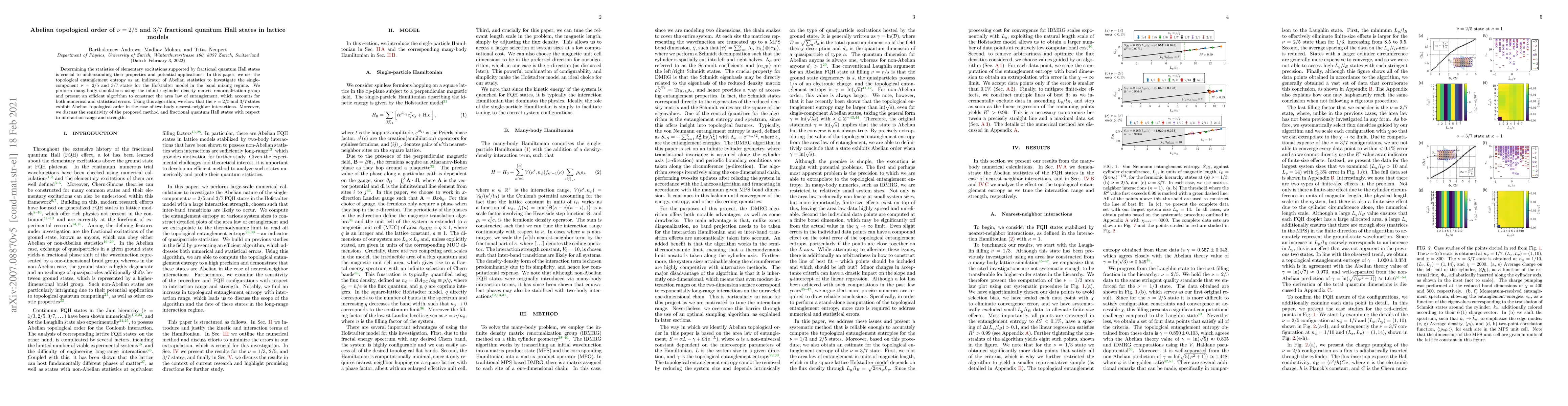 Determining the statistics of elementary excitations supported by fractional quantum Hall states is crucial to understanding their properties and potential applications. In this paper, we use the topological entanglement entropy as an indicator of Abelian statistics to investigate the single-component $\nu=2/5$ and $3/7$ states for the Hofstadter model in the band mixing regime. We perform many-body simulations using the infinite cylinder density matrix renormalization group and present an efficient algorithm to construct the area law of entanglement, which accounts for both numerical and statistical errors. Using this algorithm, we show that the $\nu=2/5$ and $3/7$ states exhibit Abelian topological order in the case of two-body nearest-neighbor interactions. Moreover, we discuss the sensitivity of the proposed method and fractional quantum Hall states with respect to interaction range and strength.