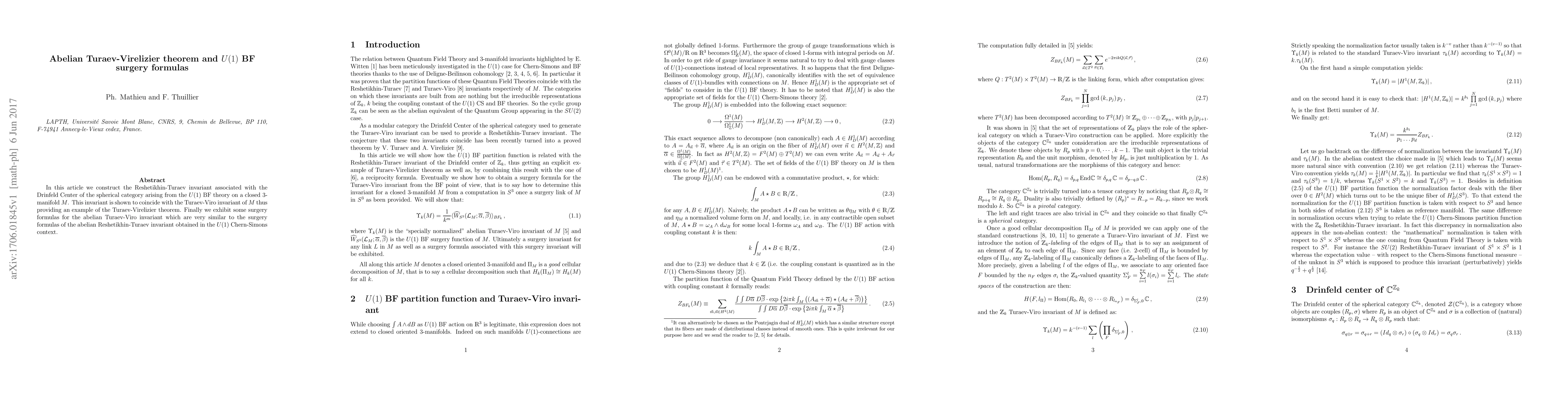 Researchers construct a Reshetikhin-Turaev invariant for U(1) BF theory on closed 3-manifolds, showing it coincides with the Turaev-Viro invariant and exhibiting similar surgery formulas.