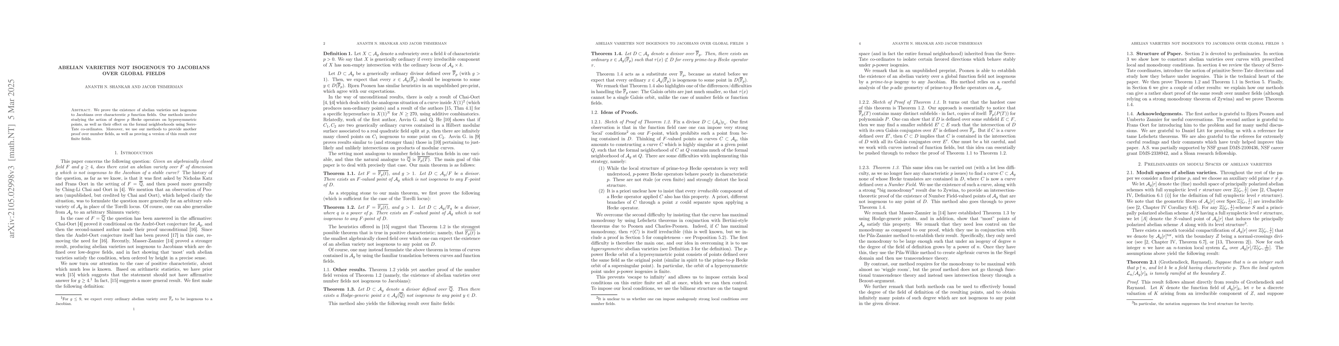 This paper proves the existence of abelian varieties over characteristic $p$ function fields that are not isogenous to Jacobians, using degree $p$ Hecke operators and Serre-Tate coordinates. It also provides alternative proofs for number fields and finite fields.