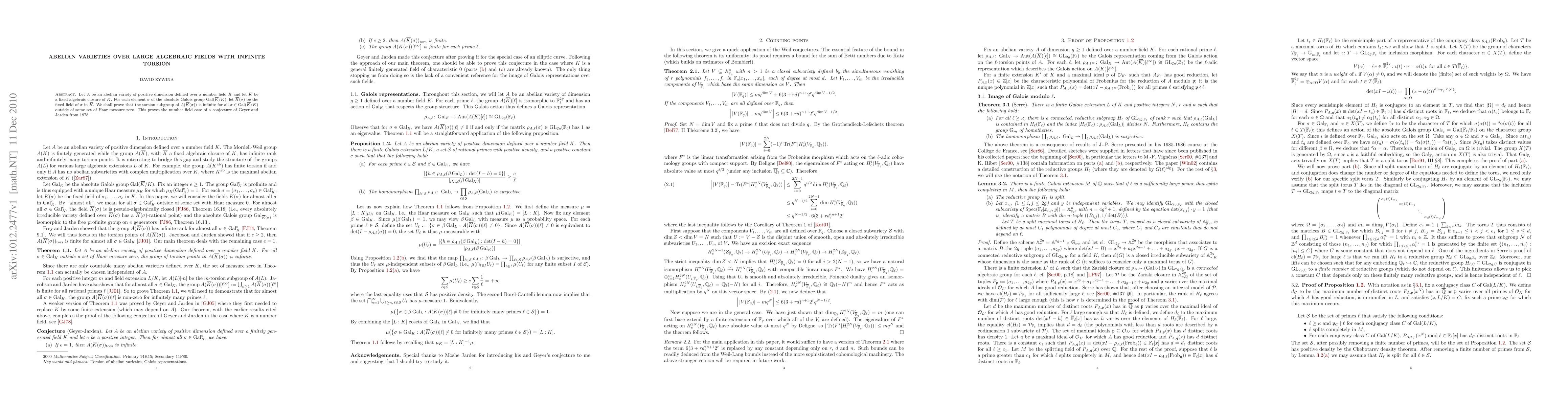 This paper proves that for an abelian variety A over a number field K, the torsion subgroup of A's points over any field Kbar(sigma) derived from the absolute Galois group Gal(Kbar/K) is infinite for almost all sigma, verifying a conjecture by Geyer and Jarden from 1978.