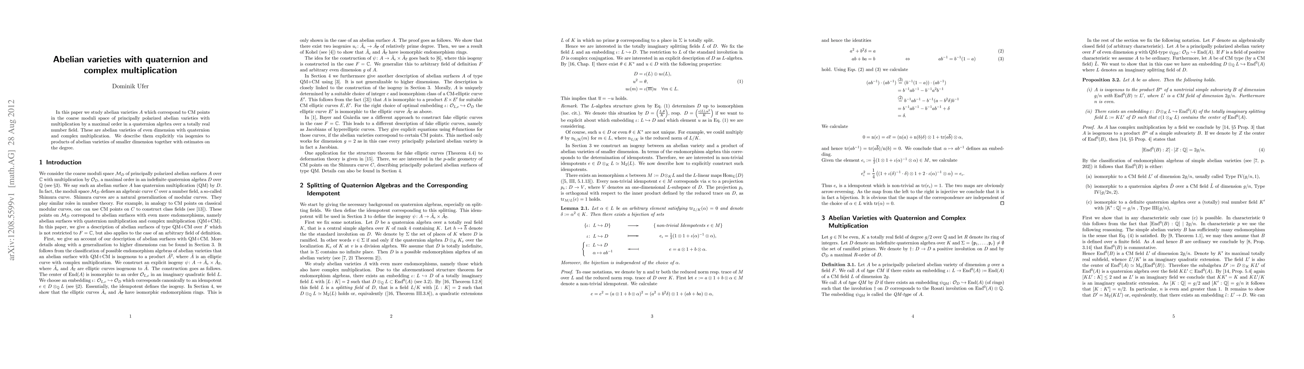The paper presents a detailed description of abelian varieties with quaternion and complex multiplication, utilizing isogenies to decompose them into products of lower-dimensional abelian varieties with controlled degree estimates.
