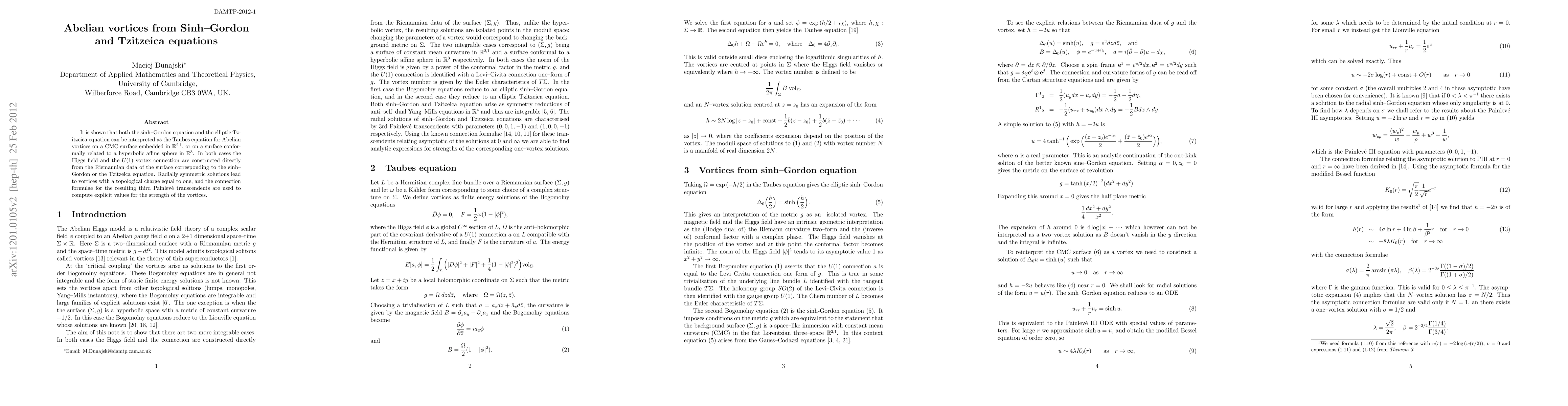 The paper demonstrates that the sinh-Gordon and elliptic Tzitzeica equations describe Abelian vortices on certain embedded surfaces in higher-dimensional spaces, deriving the Higgs field and vortex connection from surface Riemannian data. Explicit values for vortex strength are computed using connection formulae from third Painlevé transcendents.