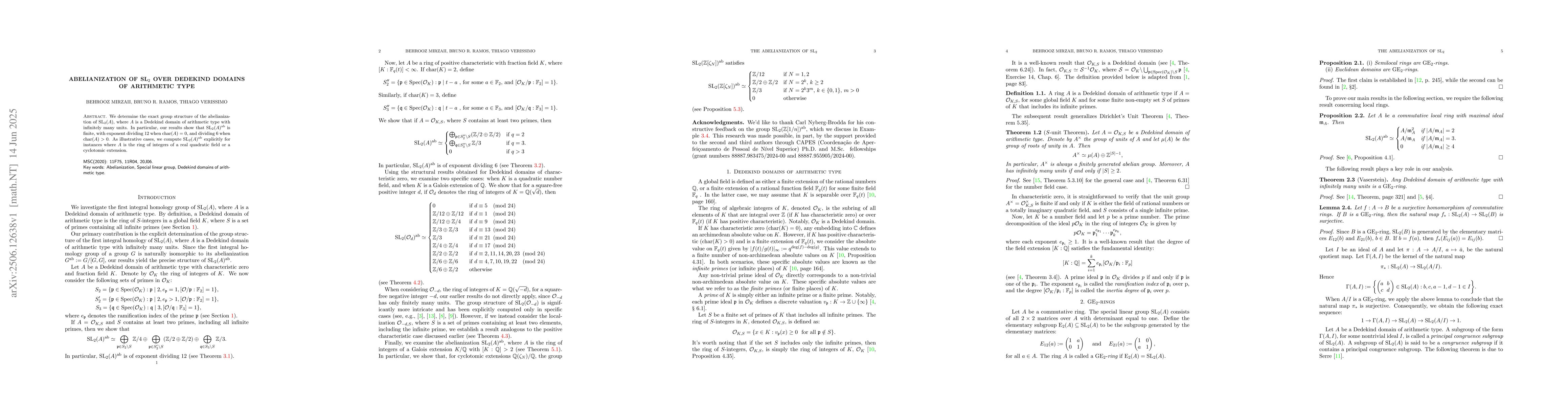 We determine the exact group structure of the abelianization of $\text{SL}_2(A)$, where $A$ is a Dedekind domain of arithmetic type with infinitely many units. In particular, our results show that $\text{SL}_2(A)^\text{ab}$ is finite, with exponent dividing $12$ when $\text{char}(A)=0$, and dividing $6$ when $\text{char}(A)>0$. As illustrative cases, we compute $\text{SL}_2(A)^\text{ab}$ explicitly for instances where $A$ is the ring of integers of a real quadratic field or a cyclotomic extension.