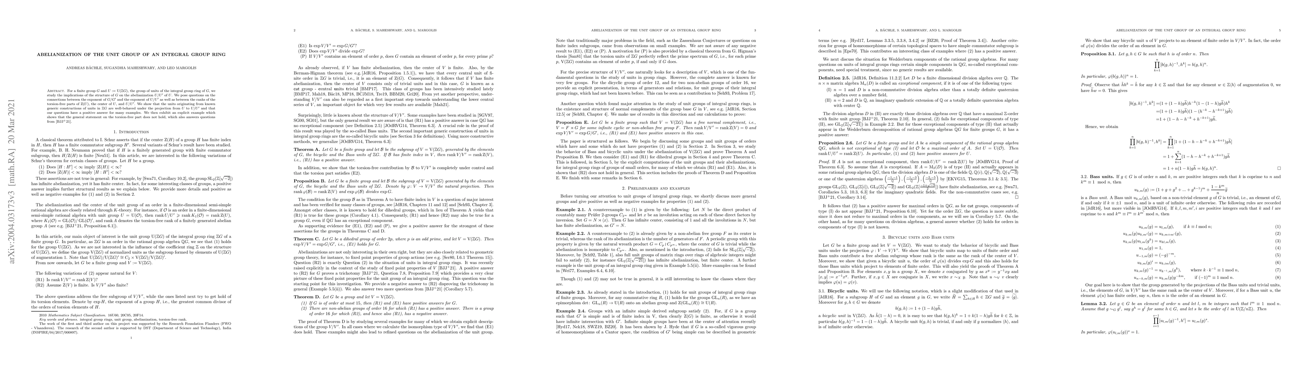 This paper investigates how the structure of a finite group $G$ influences the abelianization $U/U'$ of its unit group $U$ in the integral group ring $\mathbb{Z}G$. It finds that units from generic constructions in $\mathbb{Z}G$ behave predictably in $U/U'$, and answers questions linking the exponent and rank of $G/G'$ with $U/U'$, though a general statement about the torsion-free part is disproven with a counterexample.