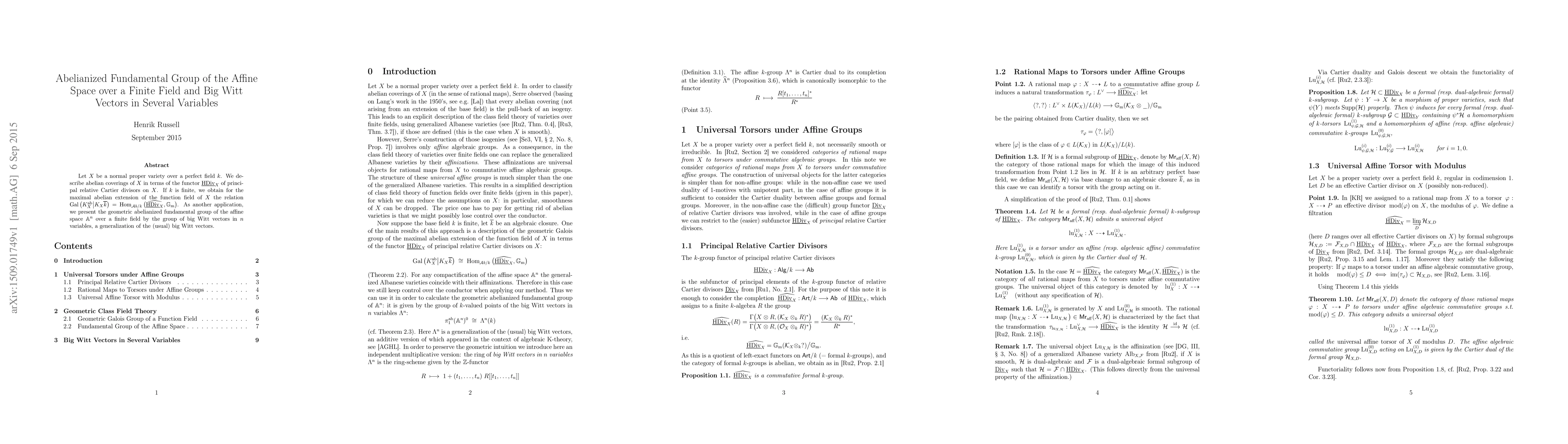 This paper explores abelian coverings of normal proper varieties over perfect fields, linking them to the functor of principal relative Cartier divisors. It specifically identifies the abelianized fundamental group of affine $n$-space over a finite field with the group of big Witt vectors in $n$ variables, extending the concept of big Witt vectors.