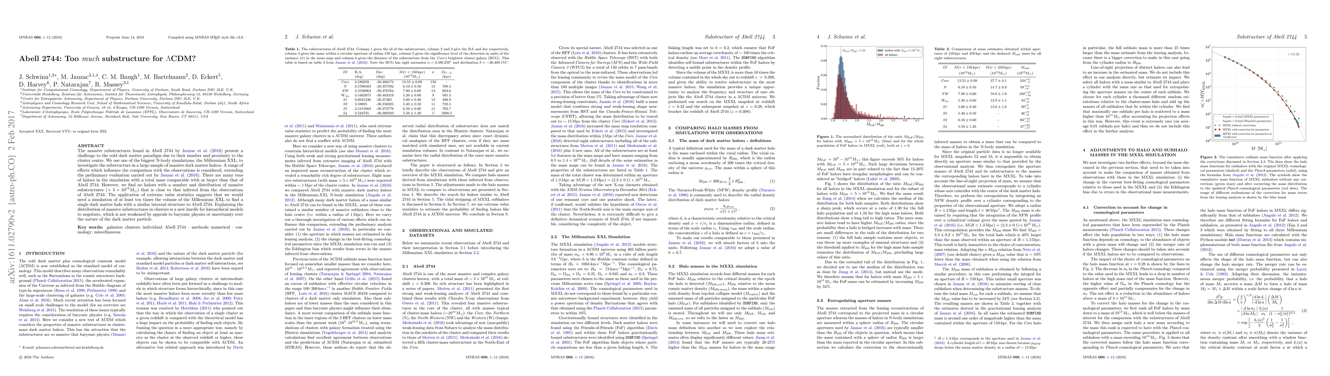 The paper investigates the massive substructures in Abell 2744, finding they challenge the cold dark matter model. Using the Millennium XXL simulation, it concludes that no comparable haloes exhibit similar substructure numbers and distribution, suggesting a significant hurdle for current hierarchical models.