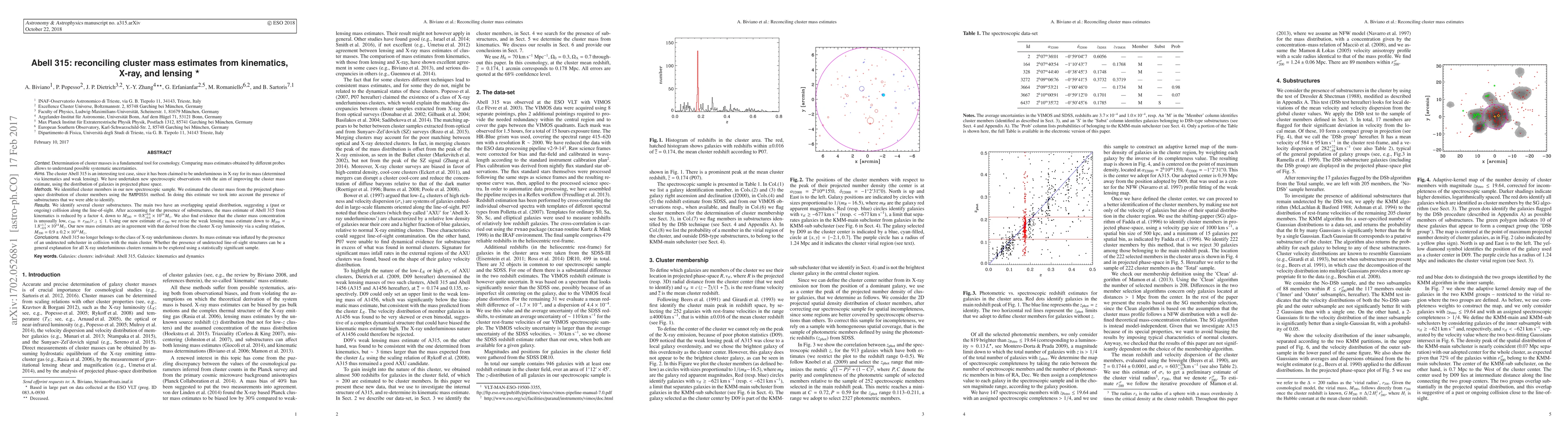 This paper reconciles mass estimates for the cluster Abell 315 using kinematics, X-ray, and lensing data, revealing that previous mass estimates were inflated due to undetected subclusters. The new estimate, accounting for substructures, aligns the cluster's mass with its X-ray luminosity, removing it from the list of X-ray underluminous clusters.